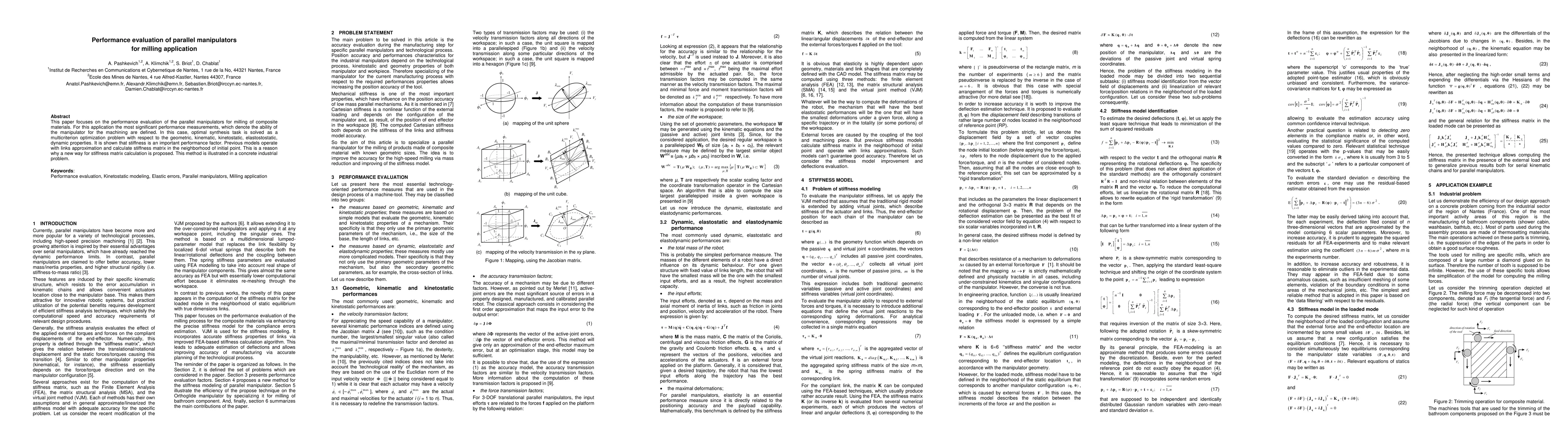 This paper evaluates parallel manipulators for milling composite materials, defining key performance metrics and solving an optimization problem to enhance geometric, kinematic, and dynamic properties. A novel method for stiffness matrix calculation is proposed, improving accuracy over previous link approximation models.