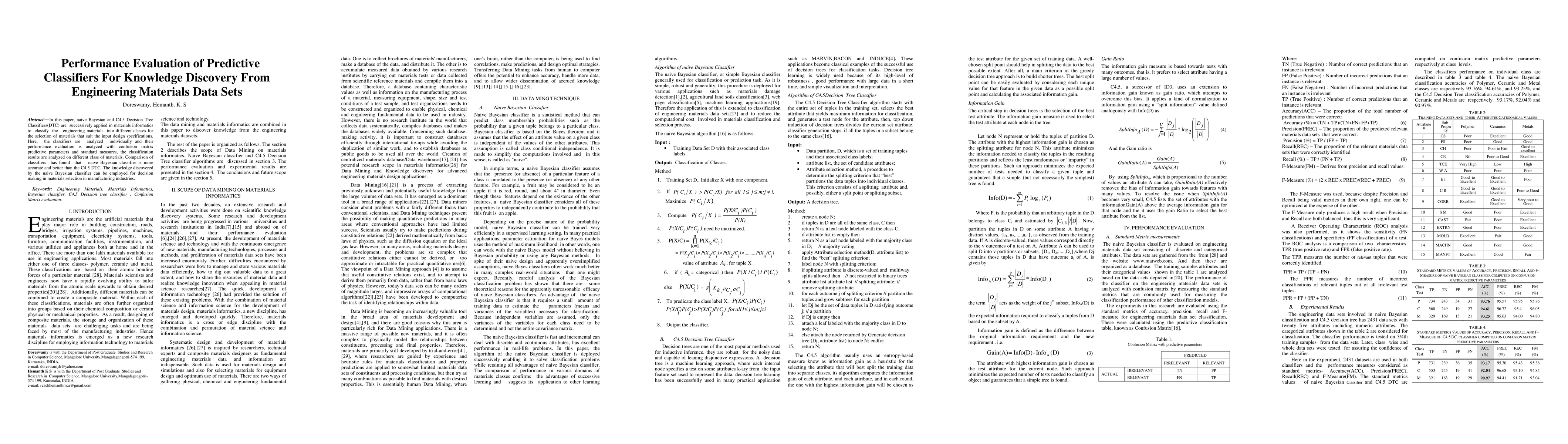 This paper evaluates naive Bayesian and C4.5 Decision Tree Classifiers for classifying engineering materials based on design specifications. The naive Bayesian classifier outperforms the C4.5 DTC, providing more accurate results and useful knowledge for decision-making in materials selection.