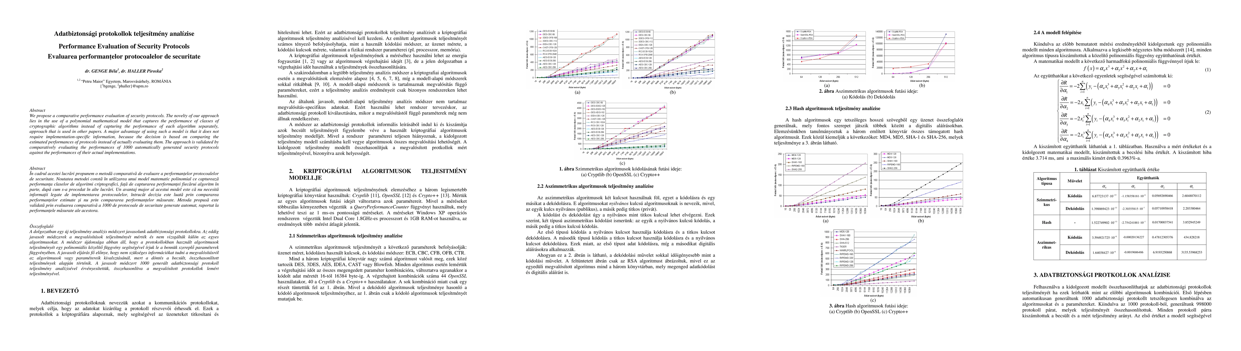 We propose a comparative performance evaluation of security protocols. The novelty of our approach lies in the use of a polynomial mathematical model that captures the performance of classes of cryptographic algorithms instead of capturing the performance of each algorithm separately, approach that is used in other papers. A major advantage of using such a model is that it does not require implementation-specific information, because the decision is based on comparing the estimated performances of protocols instead of actually evaluating them. The approach is validated by comparatively evaluating the performances of 1000 automatically generated security protocols against the performances of their actual implementations.