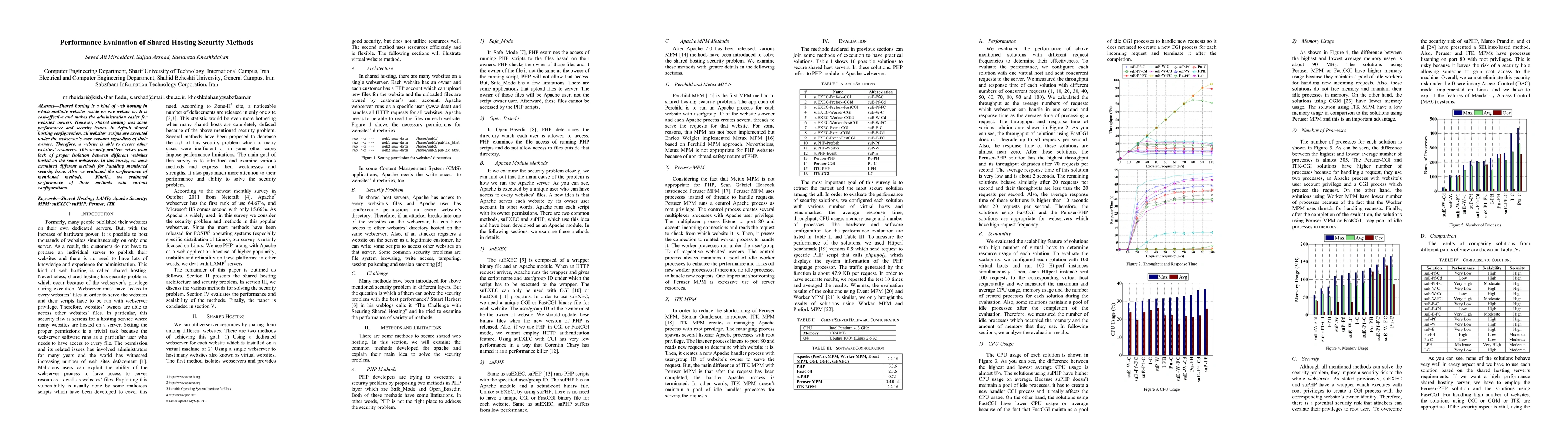 This paper evaluates the effectiveness of various shared hosting security methods to address vulnerabilities in shared hosting configurations. It concludes that certain security methods improve performance and isolation between websites.