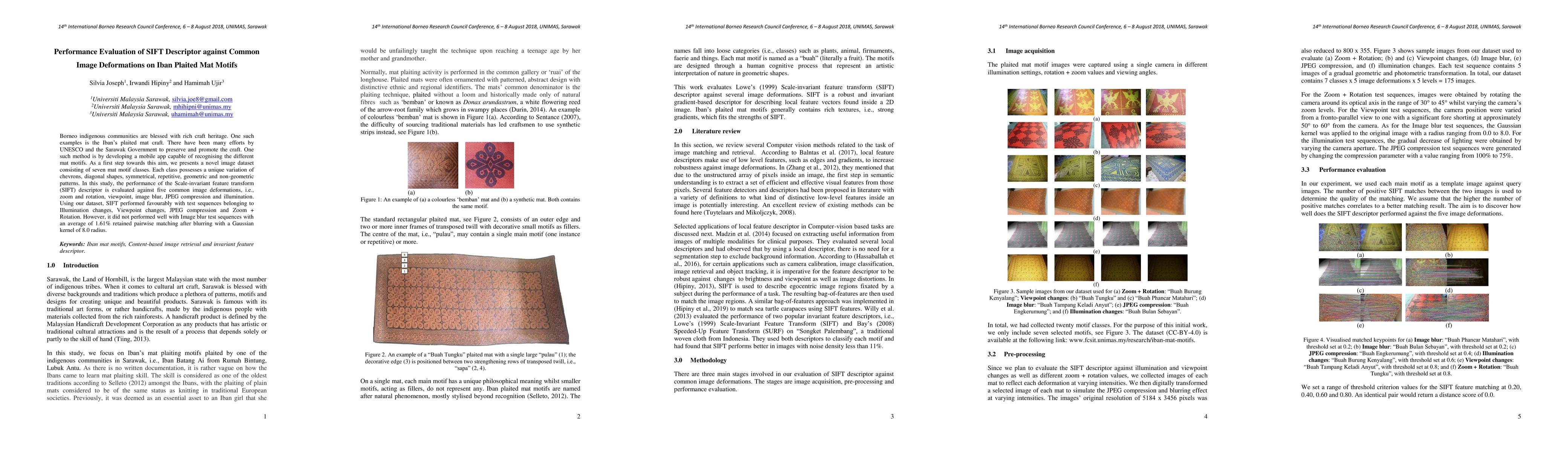 The SIFT descriptor performed well against common image deformations on Iban plaited mat motifs, but struggled with blurring, retaining an average of 1.61% matching pairs.