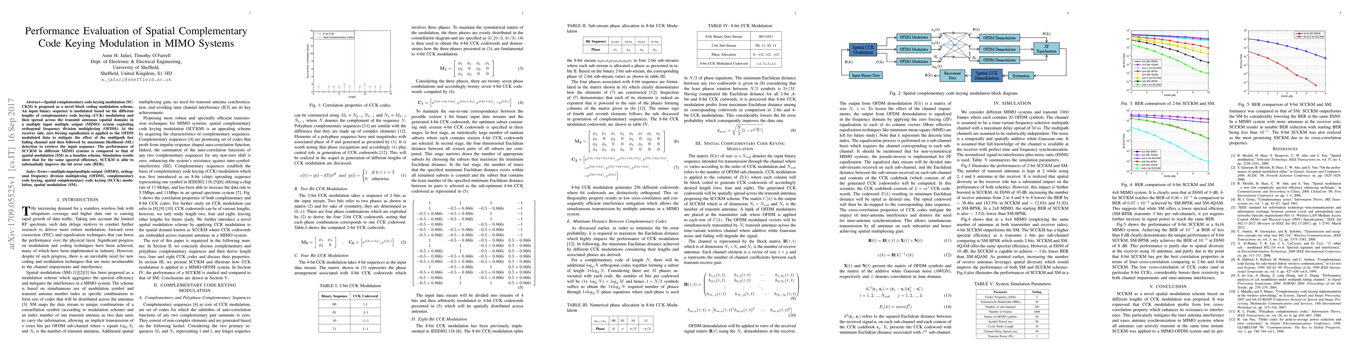 Spatial complementary code keying modulation (SCCKM) is proposed as a novel block coding modulation scheme. An input binary sequence is modulated based on the different lengths of complementary code keying (CCK) modulation and then spread across the transmit antennas (spatial domain) in a multiple input multiple output (MIMO) system exploiting orthogonal frequency division multiplexing (OFDM). At the receiver side, zero forcing equalization is applied to the OFDM modulated data to mitigate the effect of the multipath fast fading channel and then followed by maximum likelihood (ML) detection to retrieve the input sequence. The performance of SCCKM in different MIMO systems is compared to that of spatial modulation (SM) as a baseline scheme. Simulation results show that for the same spectral efficiency, SCCKM is able to substantially improve the bit error rate (BER).
