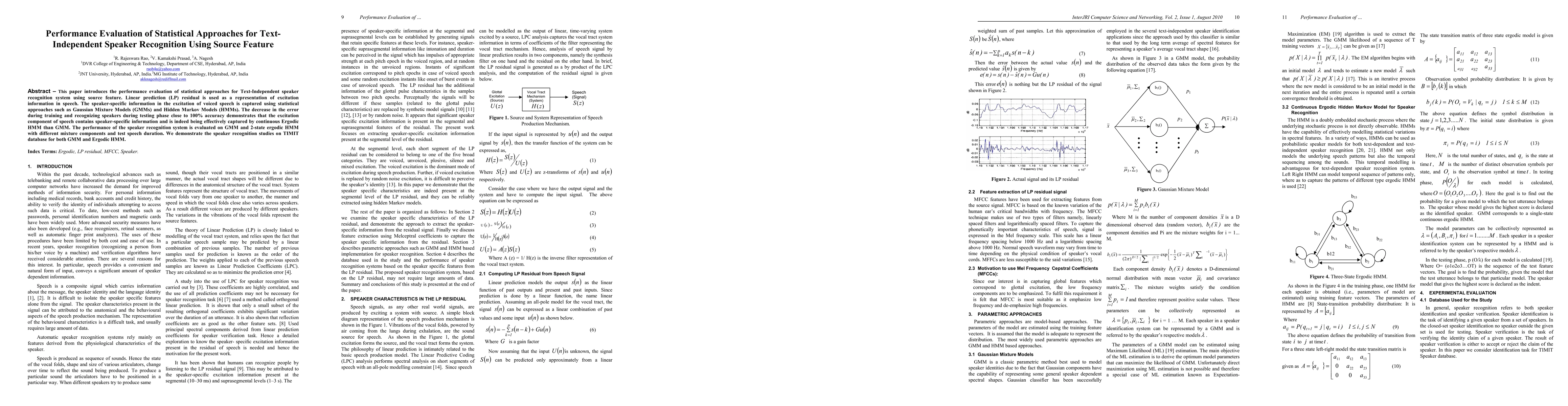 This paper introduces the performance evaluation of statistical approaches for TextIndependent speaker recognition system using source feature. Linear prediction LP residual is used as a representation of excitation information in speech. The speaker-specific information in the excitation of voiced speech is captured using statistical approaches such as Gaussian Mixture Models GMMs and Hidden Markov Models HMMs. The decrease in the error during training and recognizing speakers during testing phase close to 100 percent accuracy demonstrates that the excitation component of speech contains speaker-specific information and is indeed being effectively captured by continuous Ergodic HMM than GMM. The performance of the speaker recognition system is evaluated on GMM and 2 state ergodic HMM with different mixture components and test speech duration. We demonstrate the speaker recognition studies on TIMIT database for both GMM and Ergodic HMM.