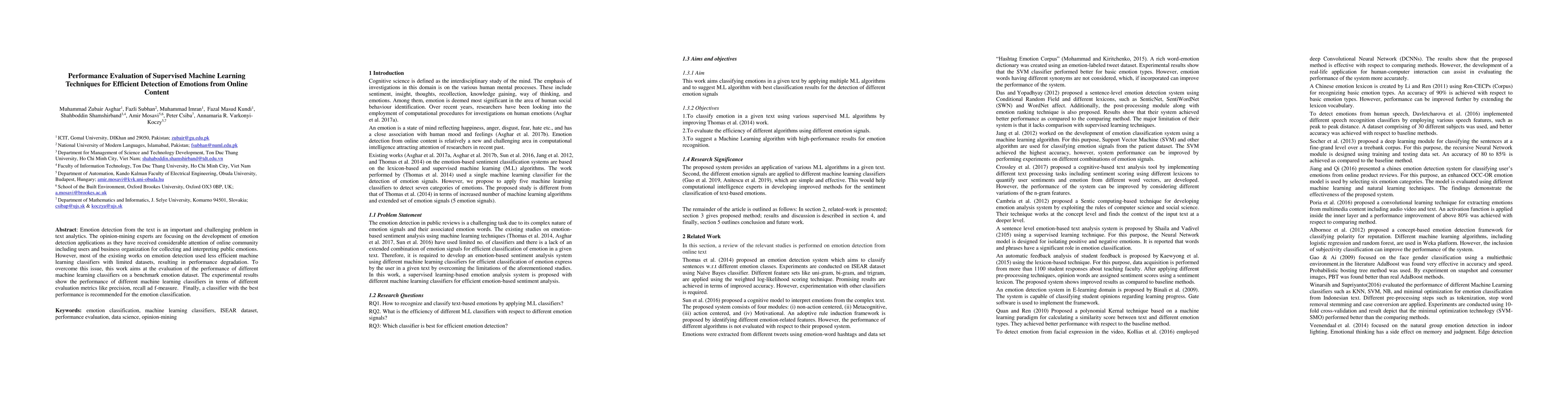 This paper evaluates various supervised machine learning techniques for detecting emotions from online text, aiming to identify the most efficient classifier using a benchmark dataset. Experimental results highlight the performance metrics of different classifiers, recommending the best-performing one for emotion classification.