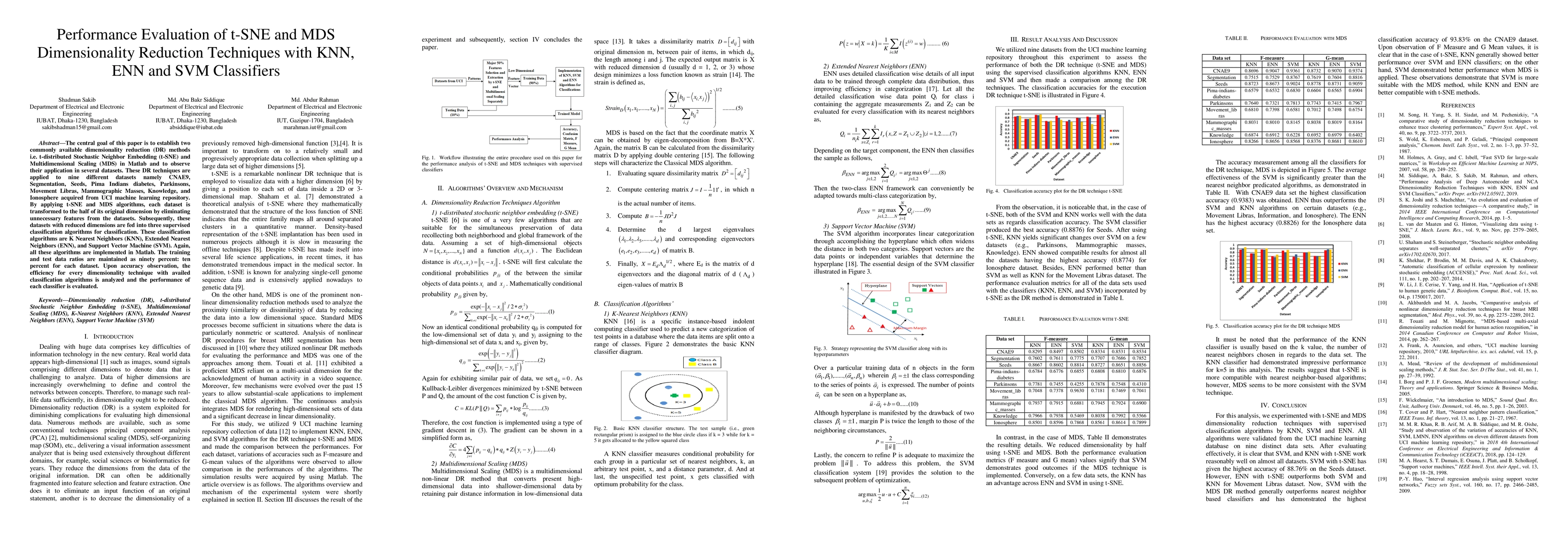 This paper evaluates the performance of t-SNE and MDS dimensionality reduction techniques on nine datasets, applying them to reduce feature space before classification with KNN, ENN, and SVM. The results assess the effectiveness of each method in improving classification accuracy.