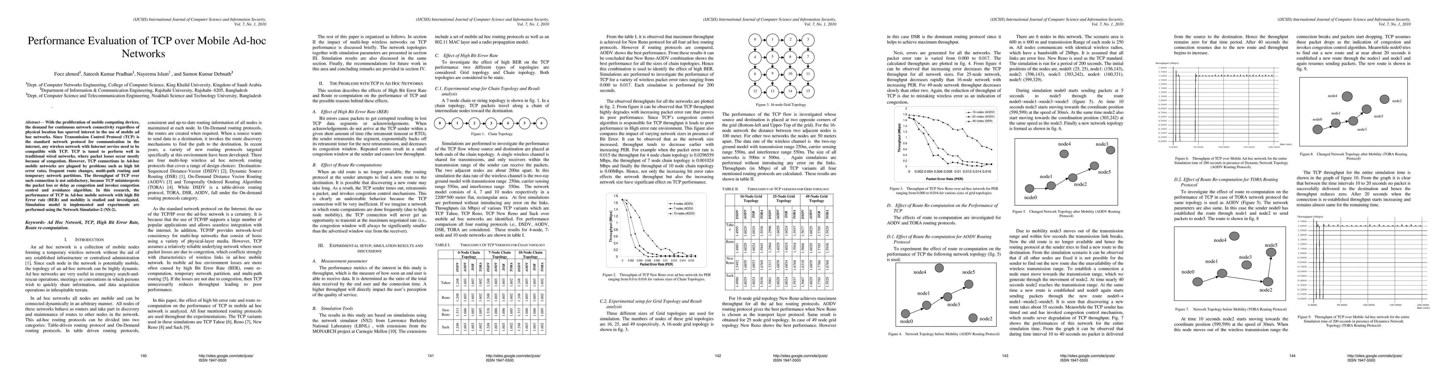 This research evaluates TCP performance in mobile ad hoc networks, focusing on challenges like high bit error rates, frequent route changes, and temporary partitions. Using NS2 simulations, the study investigates how TCP misinterprets packet loss and delays, leading to suboptimal throughput.