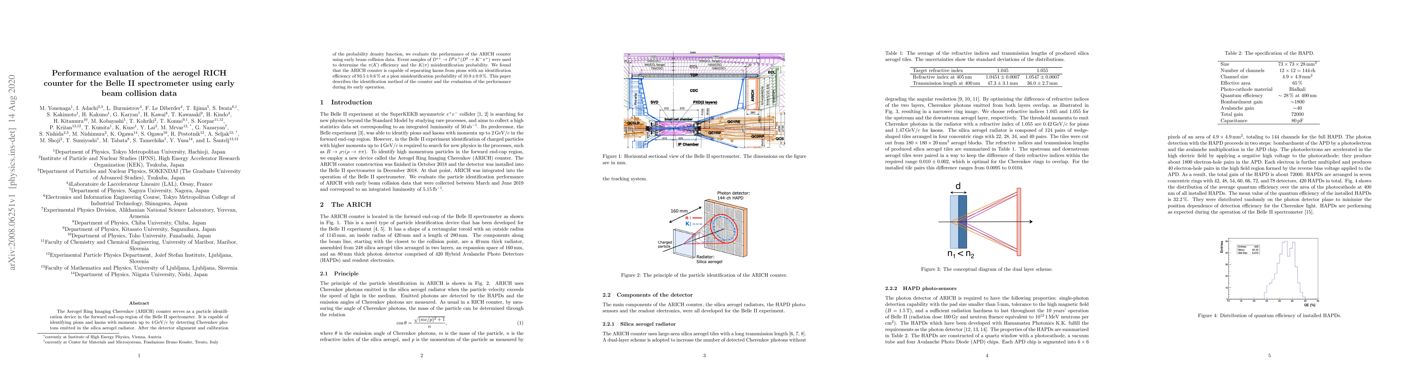 The Aerogel Ring Imaging Cherenkov (ARICH) counter in the Belle II spectrometer effectively identifies pions and kaons up to $4 \, {\rm GeV}/c$ using early beam collision data, achieving a $93.5 \pm 0.6 \, \%$ identification efficiency with a pion misidentification probability of $10.9 \pm 0.9 \, \%$.
