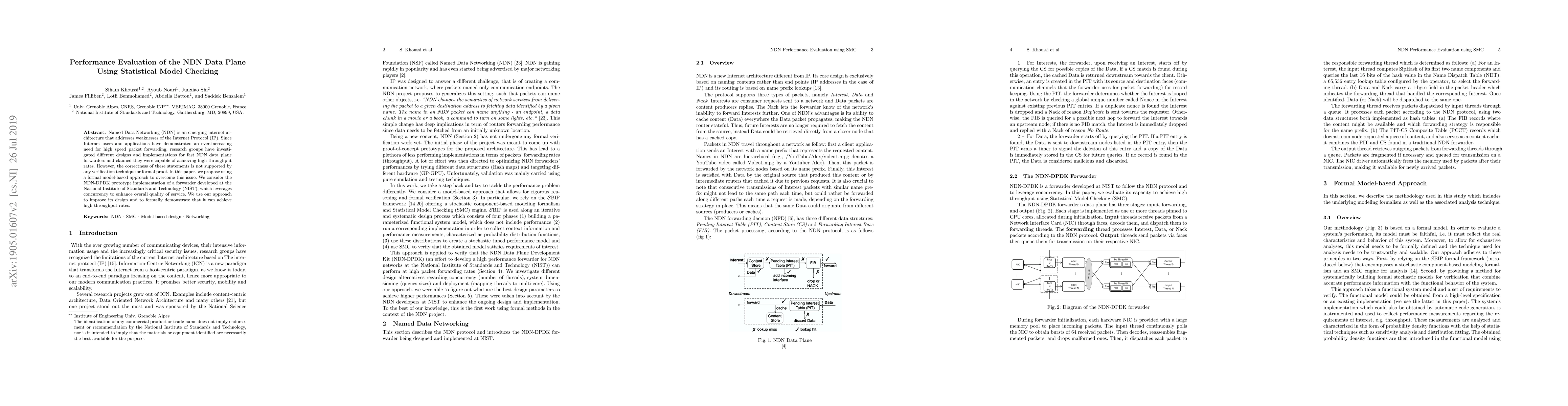 This paper proposes a formal model-based approach to verify the performance claims of NDN data plane forwarders, specifically the NDN-DPDK prototype. It demonstrates that the NDN-DPDK implementation can achieve high throughput rates through statistical model checking.