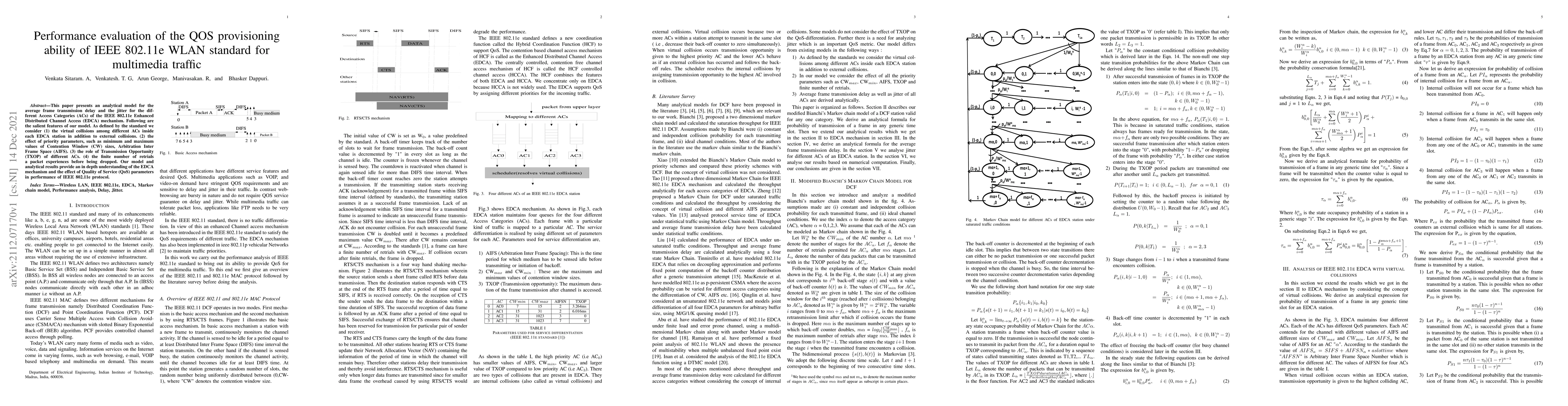 This paper develops an analytical model to evaluate the average frame transmission delay and jitter for different Access Categories in IEEE 802.11e EDCA, considering factors like virtual collisions, priority parameters, and TXOP, providing insights into QoS provisioning for multimedia traffic.