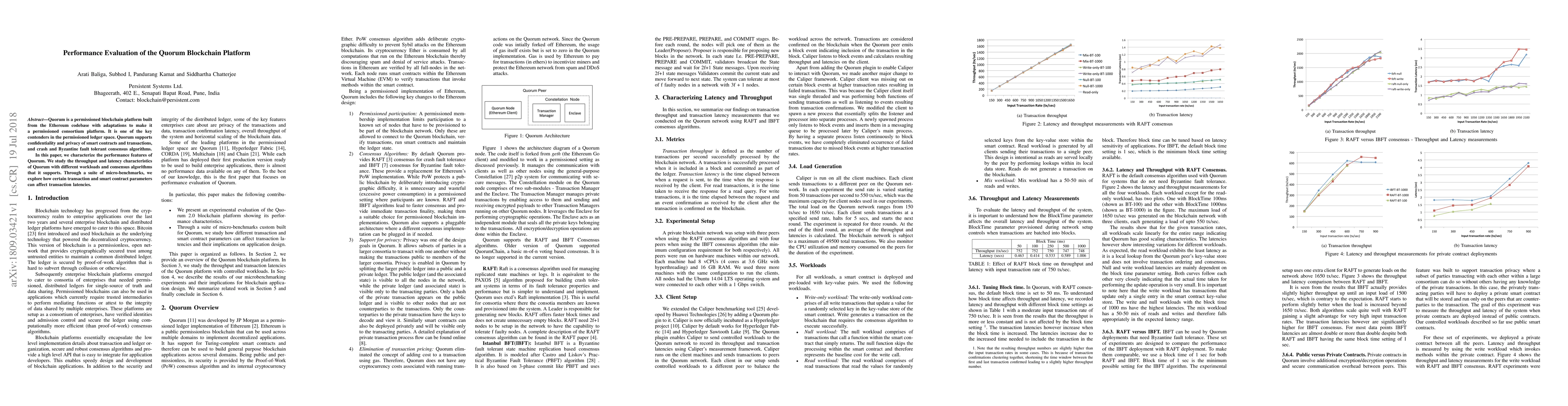 This paper evaluates Quorum, a permissioned blockchain platform, focusing on its throughput and latency with various workloads and consensus algorithms. It also examines how specific transaction and smart contract parameters impact transaction latencies through micro-benchmarks.
