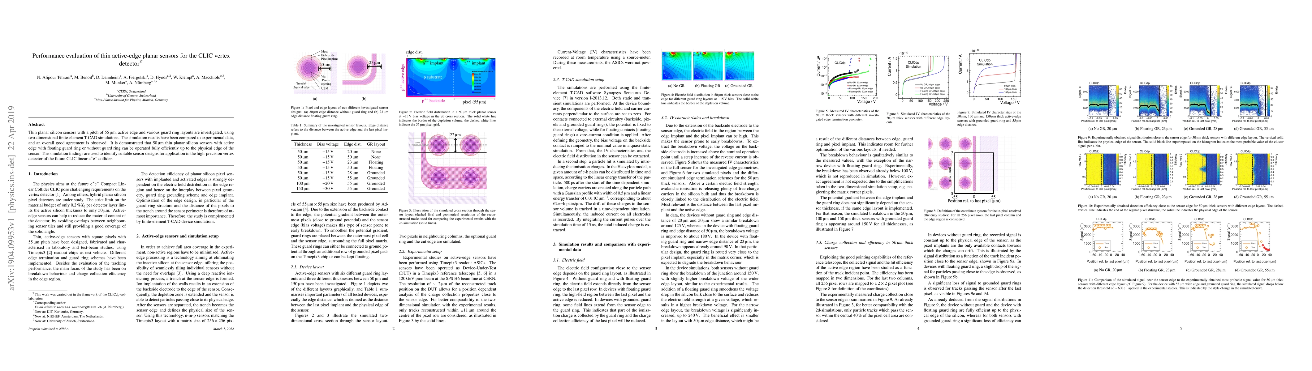 Thin planar silicon sensors with a pitch of 55um, active edge and various guard ring layouts are investigated, using two-dimensional finite-element T-CAD simulations. The simulation results have been compared to experimental data, and an overall good agreement is observed. It is demonstrated that 50um thin planar silicon sensors with active edge with floating guard ring or without guard ring can be operated fully efficiently up to the physical edge of the sensor. The simulation findings are used to identify suitable sensor designs for application in the high-precision vertex detector of the future CLIC linear $e^+e^-$ collider.