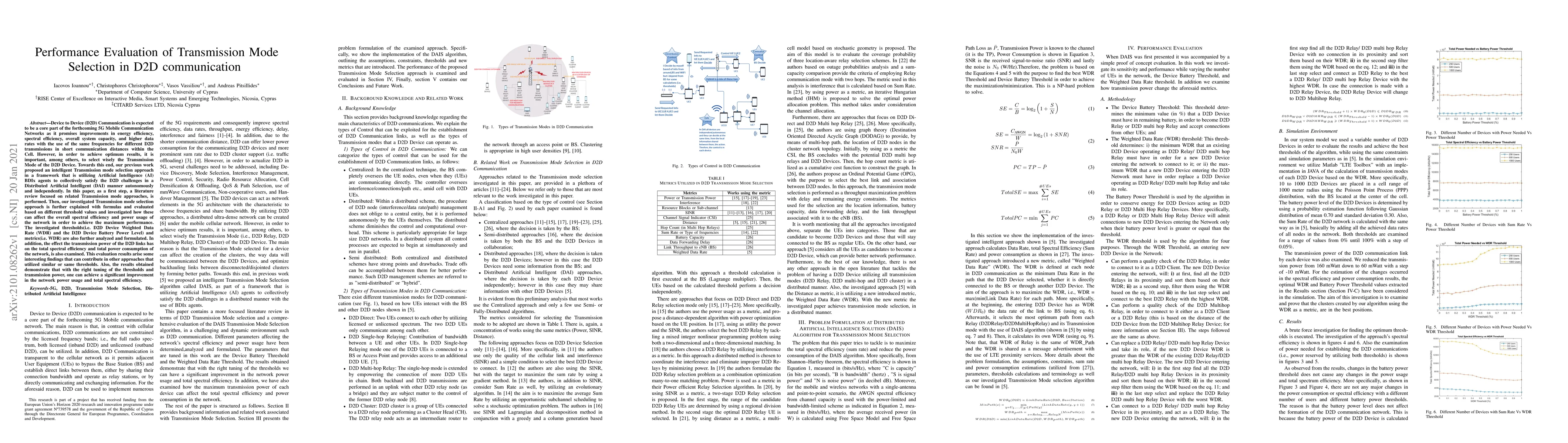 Device to Device (D2D) Communication is expected to be a core part of the forthcoming 5G Mobile Communication Networks as it promises improvements in energy efficiency, spectral efficiency, overall system capacity, and higher data rates with the use of the same frequencies for different D2D transmissions in short communication distances within the Cell. However, in order to achieve optimum results, it is important, among others, to select wisely the Transmission Mode of the D2D Device. Towards this end, our previous work proposed an intelligent Transmission mode selection approach in a framework that is utilizing Artificial Intelligence (AI) BDIx agents to collectively satisfy the D2D challenges in a Distributed Artificial Intelligent (DAI) manner autonomously and independently. In this paper, as a first step, a literature review focused on related Transmission mode approaches, is performed. Then, our investigated Transmission mode selection approach is further explained with formulas and evaluated based on different threshold values and investigated how these can affect the overall spectral efficiency and power usage of the network in order to achieve the maximum performance. The investigated thresholds(i.e. D2D Device Weighted Data Rate (WDR) and the D2D Device Battery Power Level) and metrics(i.e. WDR) are also further analyzed and formulated. In addition, the effect the transmission power of the D2D links has on the total spectral efficiency and total power consumption of the network, is also examined. This evaluation results arise some interesting findings that can contribute in other approaches that utilized similar or same thresholds. Also, the results obtained demonstrate that with the right tuning of the thresholds and transmission power, one can achieve a significant improvement in the network power usage and total spectral efficiency.