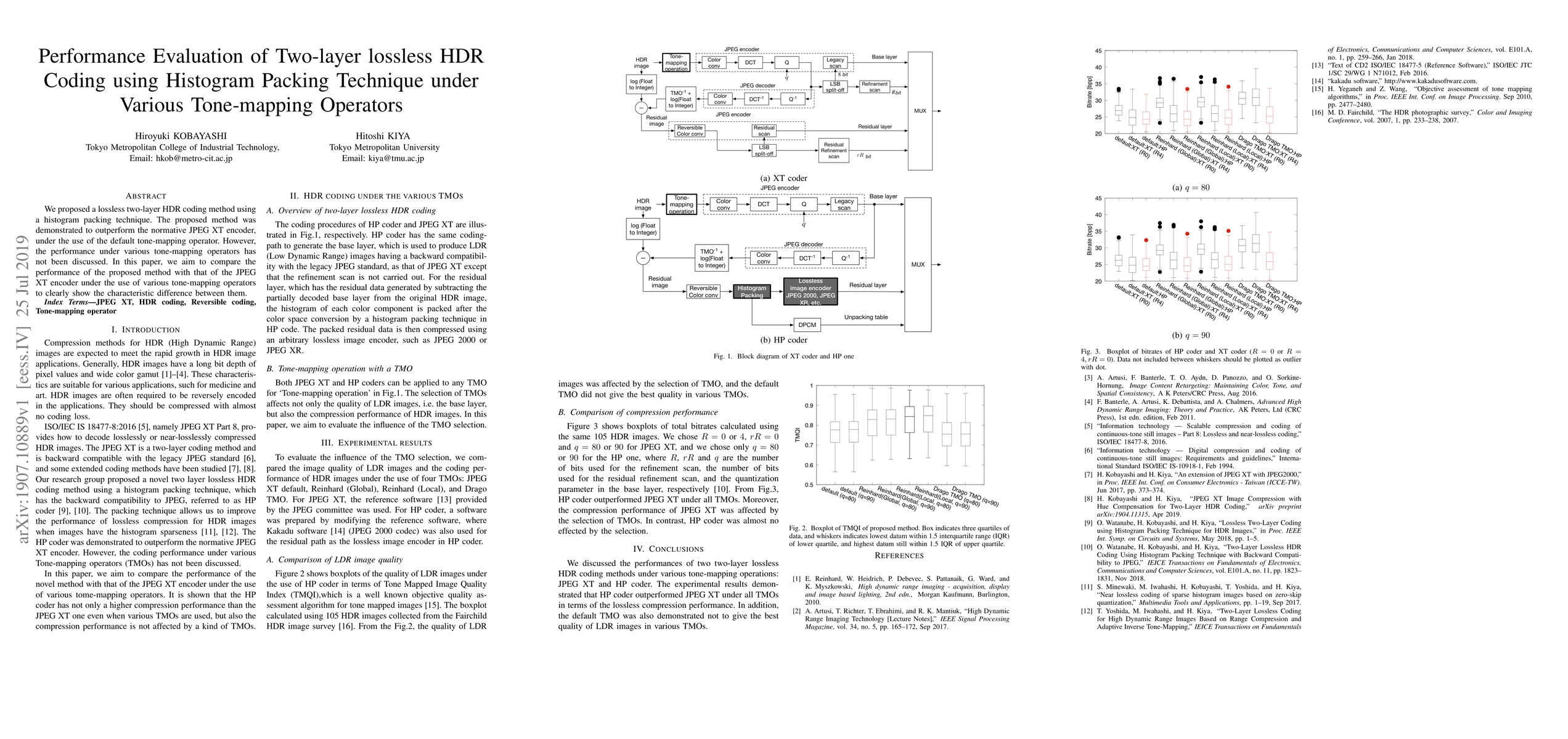This paper evaluates a lossless two-layer HDR coding method using histogram packing, comparing its performance against JPEG XT under various tone-mapping operators to highlight differences in their characteristics. The proposed method shows superior performance to JPEG XT with the default tone-mapping operator.