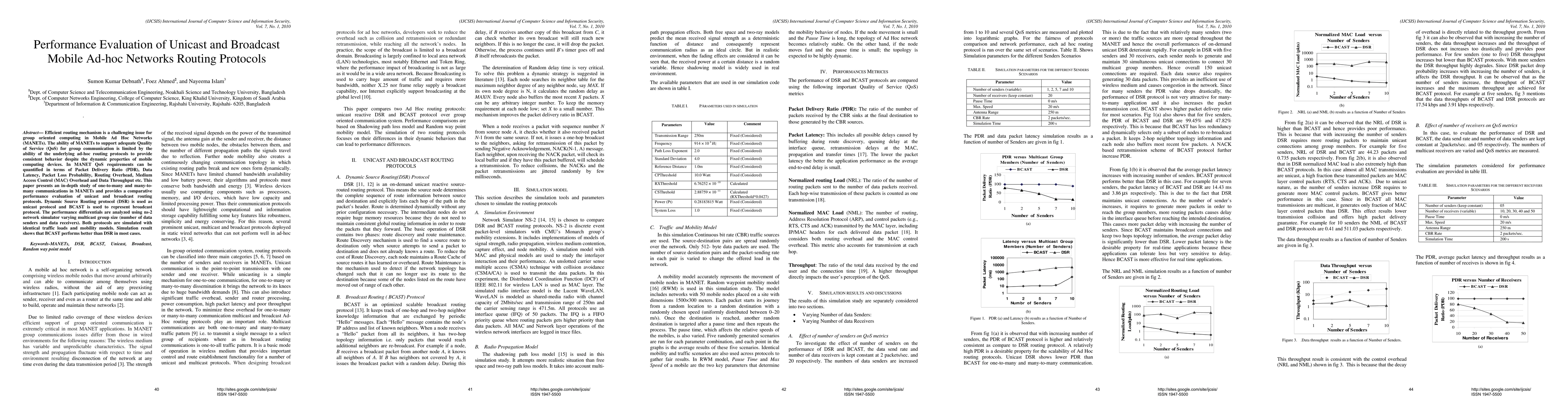 This paper evaluates the performance of unicast and broadcast routing protocols in Mobile Ad Hoc Networks (MANETs) using DSR for unicast and BCAST for broadcast. Simulation results show that BCAST generally outperforms DSR in terms of various QoS metrics.