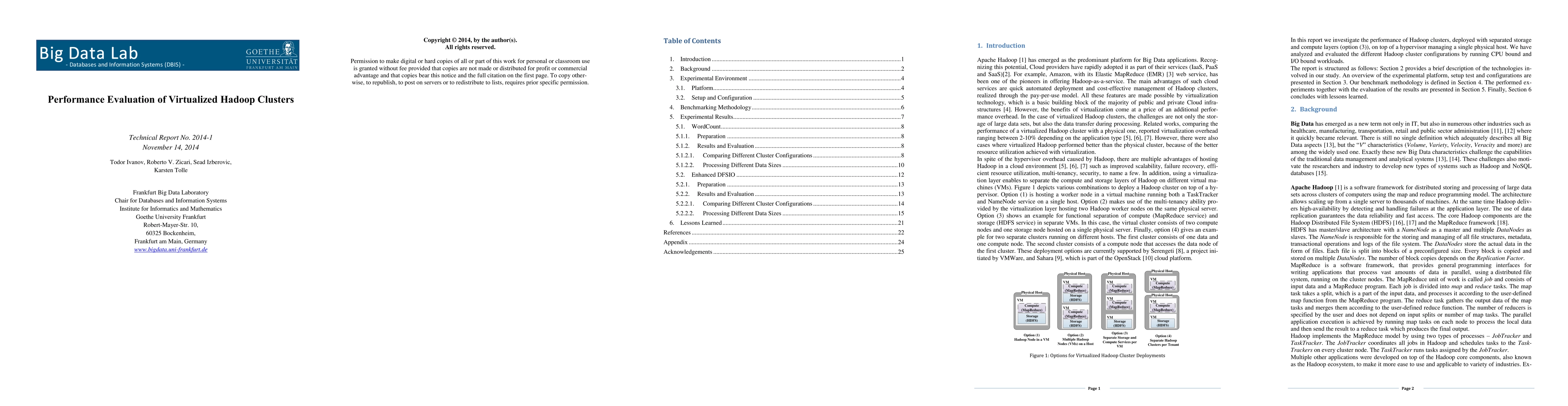 In this report we investigate the performance of Hadoop clusters, deployed with separated storage and compute layers, on top of a hypervisor managing a single physical host. We have analyzed and evaluated the different Hadoop cluster configurations by running CPU bound and I/O bound workloads. The report is structured as follows: Section 2 provides a brief description of the technologies involved in our study. An overview of the experimental platform, setup test and configurations are presented in Section 3. Our benchmark methodology is defined in Section 4. The performed experiments together with the evaluation of the results are presented in Section 5. Finally, Section 6 concludes with lessons learned.