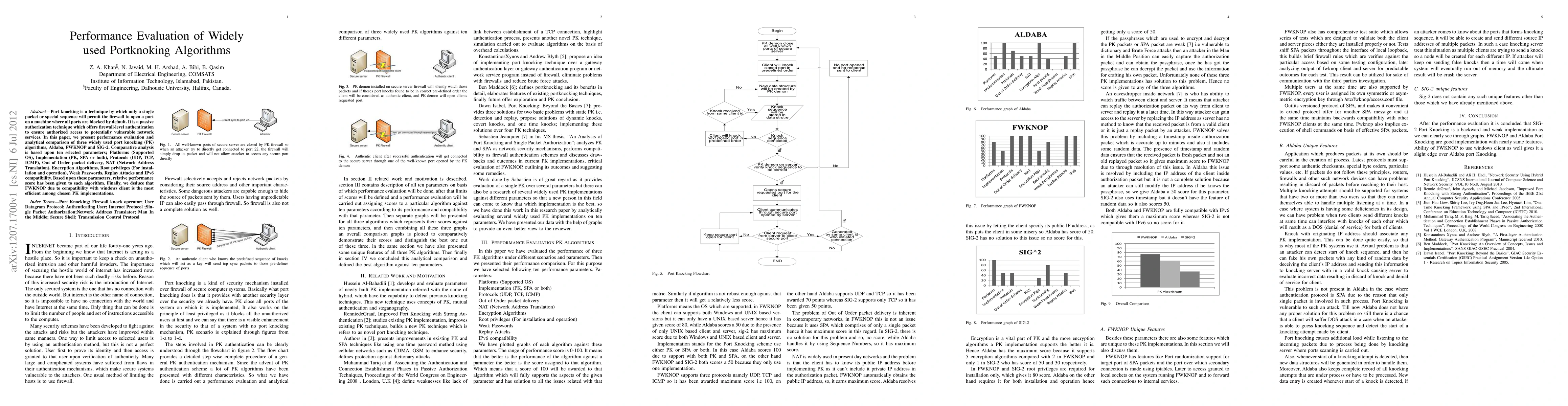 Port knocking is a technique by which only a single packet or special sequence will permit the firewall to open a port on a machine where all ports are blocked by default. It is a passive authorization technique which offers firewall-level authentication to ensure authorized access to potentially vulnerable network services. In this paper, we present performance evaluation and analytical comparison of three widely used port knocking (PK) algorithms, Aldaba, FWKNOP and SIG-2. Comparative analysis is based upon ten selected parameters; Platforms (Supported OS), Implementation (PK, SPA or both), Protocols (UDP, TCP, ICMP), Out of Order packet delivery, NAT (Network Address Translation), Encryption Algorithms, Root privileges (For installation and operation), Weak Passwords, Replay Attacks and IPv6 compatibility. Based upon these parameters, relative performance score has been given to each algorithm. Finally, we deduce that FWKNOP due to compatibility with windows client is the most efficient among chosen PK implementations.
