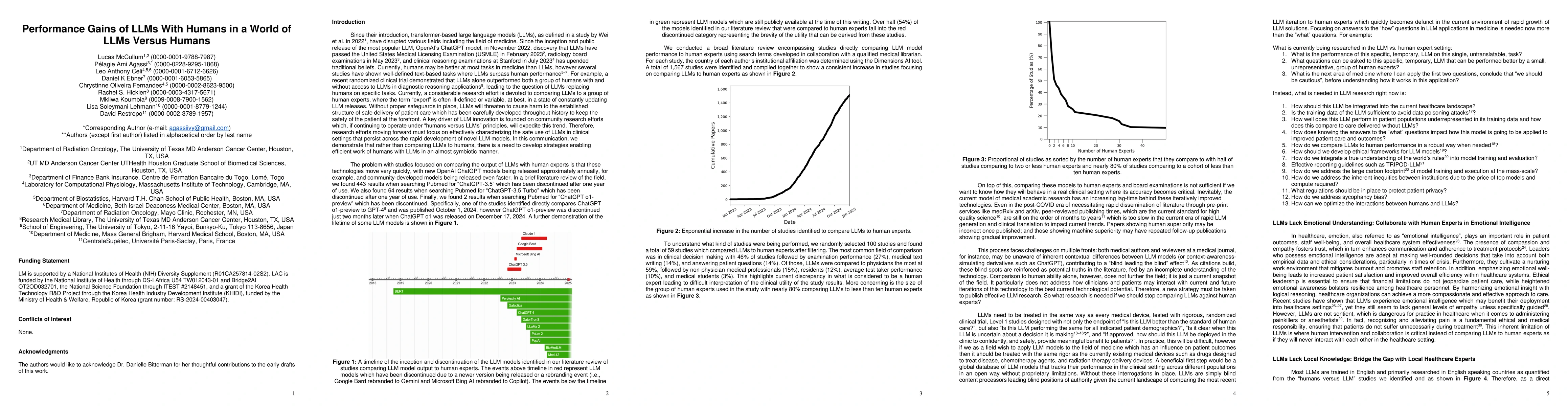 Currently, a considerable research effort is devoted to comparing LLMs to a group of human experts, where the term "expert" is often ill-defined or variable, at best, in a state of constantly updating LLM releases. Without proper safeguards in place, LLMs will threaten to cause harm to the established structure of safe delivery of patient care which has been carefully developed throughout history to keep the safety of the patient at the forefront. A key driver of LLM innovation is founded on community research efforts which, if continuing to operate under "humans versus LLMs" principles, will expedite this trend. Therefore, research efforts moving forward must focus on effectively characterizing the safe use of LLMs in clinical settings that persist across the rapid development of novel LLM models. In this communication, we demonstrate that rather than comparing LLMs to humans, there is a need to develop strategies enabling efficient work of humans with LLMs in an almost symbiotic manner.