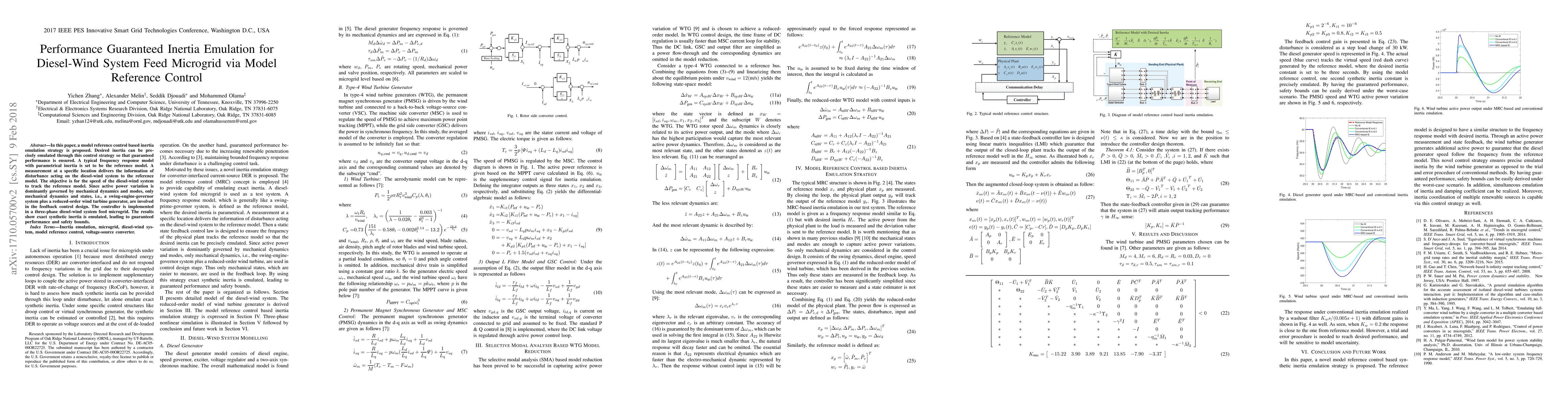This paper proposes a model reference control strategy for emulating inertia in a diesel-wind system feed microgrid, ensuring precise emulation and guaranteed performance. The control design focuses on mechanical dynamics and states, achieving exact synthetic inertia emulation and maintaining safety bounds.