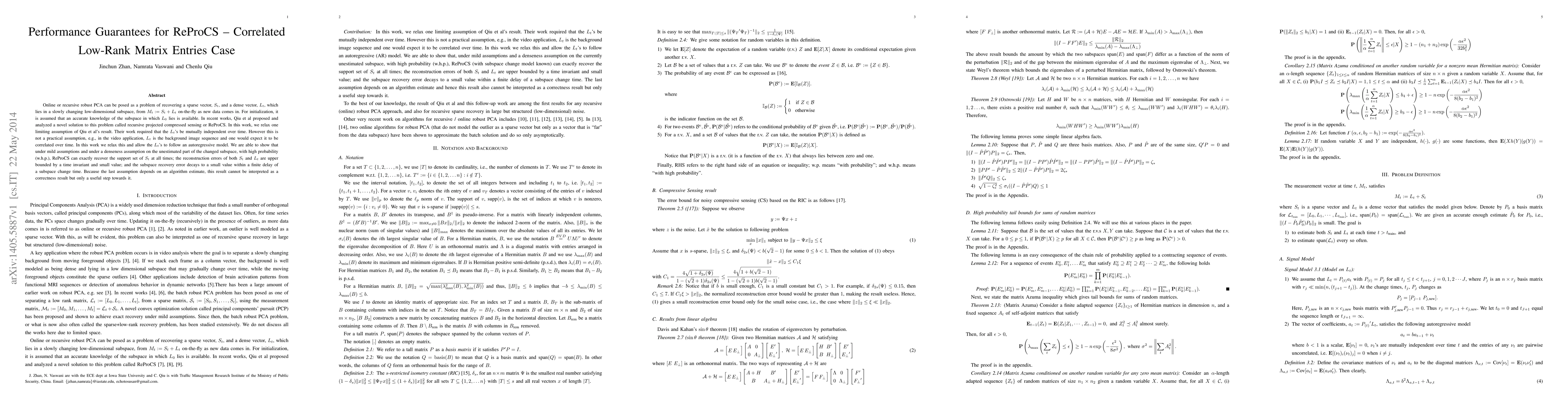 Online or recursive robust PCA can be posed as a problem of recovering a sparse vector, $S_t$, and a dense vector, $L_t$, which lies in a slowly changing low-dimensional subspace, from $M_t:= S_t + L_t$ on-the-fly as new data comes in. For initialization, it is assumed that an accurate knowledge of the subspace in which $L_0$ lies is available. In recent works, Qiu et al proposed and analyzed a novel solution to this problem called recursive projected compressed sensing or ReProCS. In this work, we relax one limiting assumption of Qiu et al's result. Their work required that the $L_t$'s be mutually independent over time. However this is not a practical assumption, e.g., in the video application, $L_t$ is the background image sequence and one would expect it to be correlated over time. In this work we relax this and allow the $L_t$'s to follow an autoregressive model. We are able to show that under mild assumptions and under a denseness assumption on the unestimated part of the changed subspace, with high probability (w.h.p.), ReProCS can exactly recover the support set of $S_t$ at all times; the reconstruction errors of both $S_t$ and $L_t$ are upper bounded by a time invariant and small value; and the subspace recovery error decays to a small value within a finite delay of a subspace change time. Because the last assumption depends on an algorithm estimate, this result cannot be interpreted as a correctness result but only a useful step towards it.