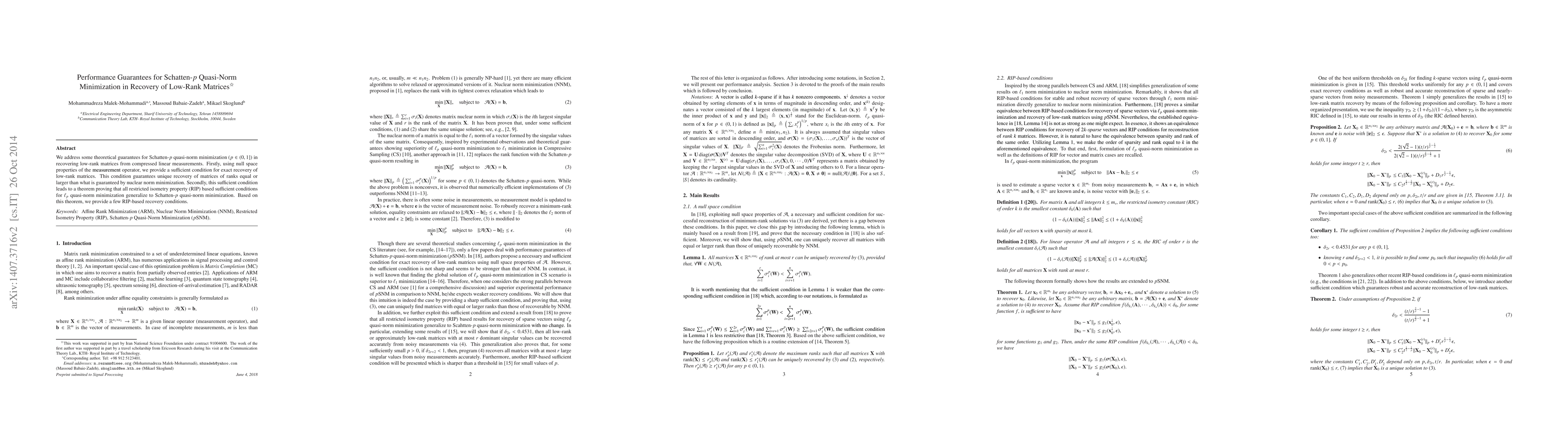 This paper provides theoretical guarantees for Schatten-$p$ quasi-norm minimization in recovering low-rank matrices from compressed measurements, offering a sufficient condition for exact recovery that surpasses nuclear norm minimization. It also generalizes RIP-based conditions for $\ell_p$ quasi-norm minimization to Schatten-$p$ quasi-norm minimization.