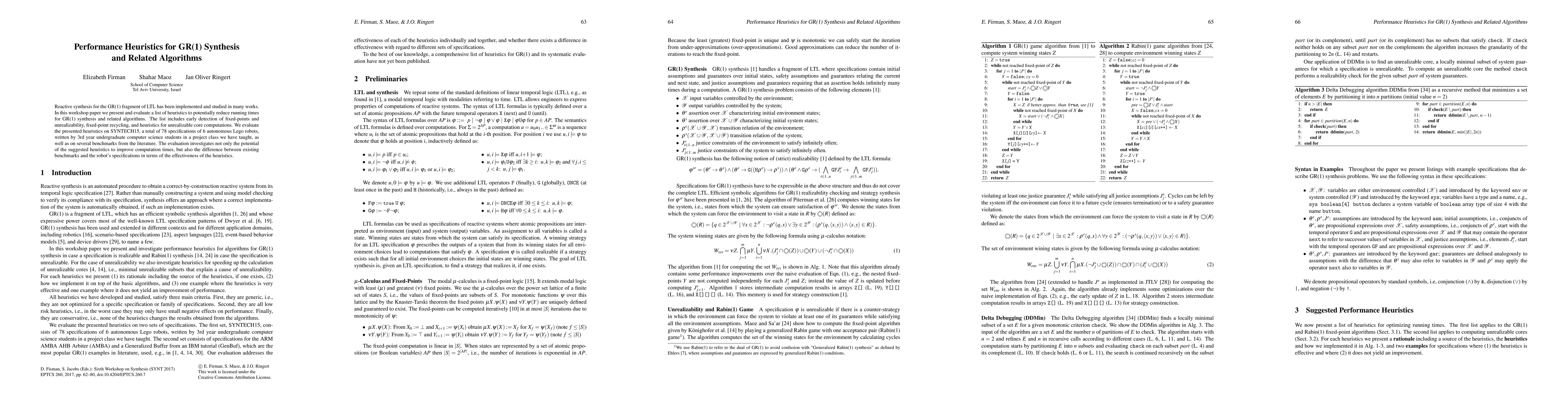 This paper presents and evaluates heuristics to reduce running times for GR(1) synthesis, including early detection of fixed-points and unrealizability, fixed-point recycling, and heuristics for unrealizable core computations. The effectiveness of these heuristics is tested on 78 specifications from a computer science project class and several literature benchmarks.