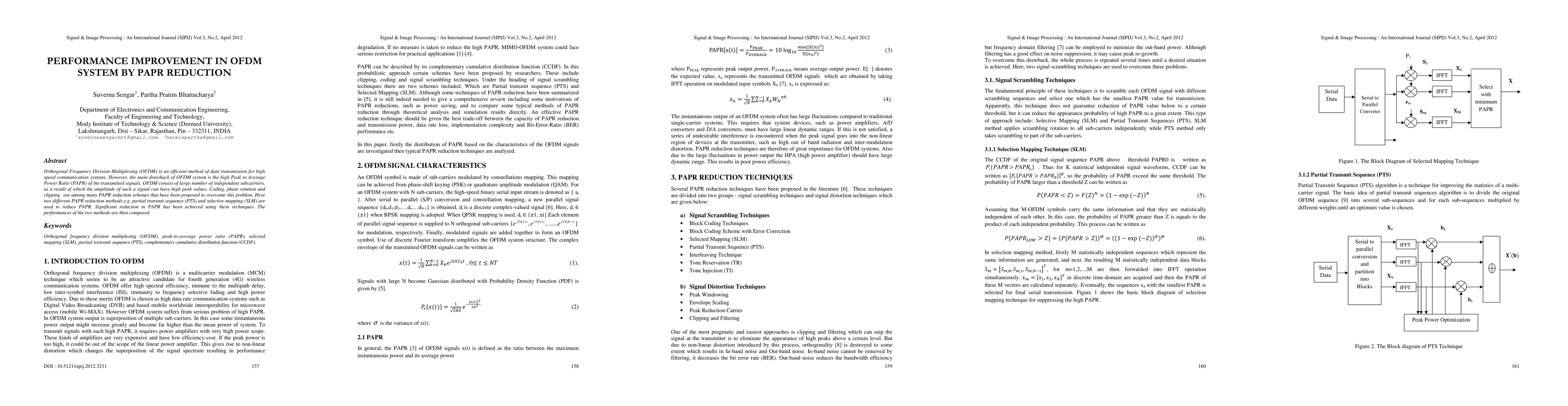 This paper investigates the reduction of Peak to Average Power Ratio (PAPR) in Orthogonal Frequency Division Multiplexing (OFDM) systems to improve performance. The study employs two PAPR reduction techniques—partial transmit sequence (PTS) and selective mapping (SLM)—demonstrating significant PAPR reduction and comparing their effectiveness.