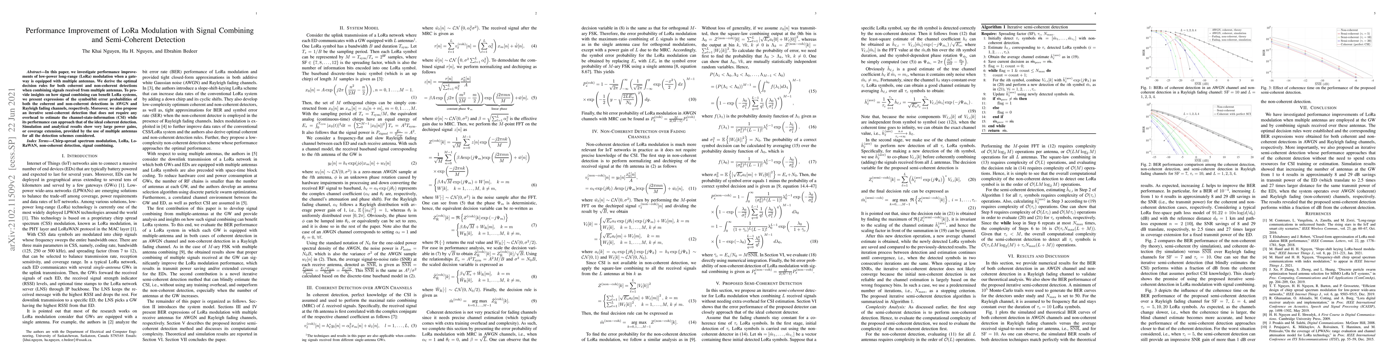 This paper explores performance enhancements for LoRa modulation using multiple antennas at the gateway, deriving optimal decision rules for coherent and non-coherent detections. It proposes an iterative semi-coherent detection method that achieves near-ideal coherent detection performance without CSI overhead, demonstrating significant power gains and coverage extension through simulations and analysis.