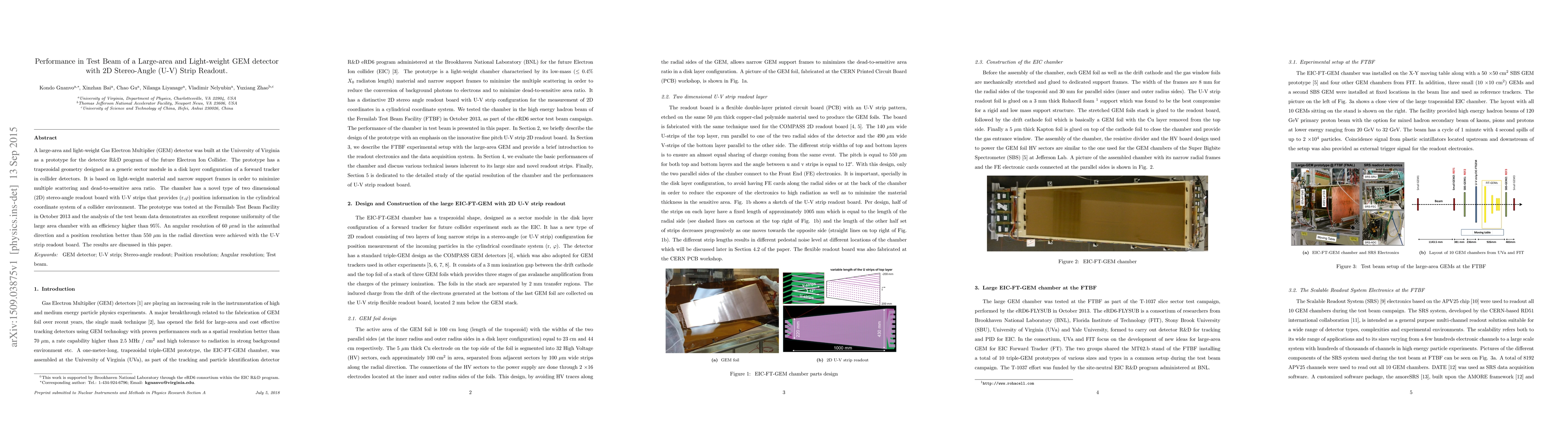 A large-area and light-weight Gas Electron Multiplier (GEM) detector was built at the University of Virginia as a prototype for the detector R$\&$D program of the future Electron Ion Collider. The prototype has a trapezoidal geometry designed as a generic sector module in a disk layer configuration of a forward tracker in collider detectors. It is based on light-weight material and narrow support frames in order to minimize multiple scattering and dead-to-sensitive area ratio. The chamber has a novel type of two dimensional (2D) stereo-angle readout board with U-V strips that provides (r,$\varphi$) position information in the cylindrical coordinate system of a collider environment. The prototype was tested at the Fermilab Test Beam Facility in October 2013 and the analysis of the test beam data demonstrates an excellent response uniformity of the large area chamber with an efficiency higher than 95%. An angular resolution of 60 $\mu$rad in the azimuthal direction and a position resolution better than 550 $\mu$m in the radial direction were achieved with the U-V strip readout board. The results are discussed in this paper.