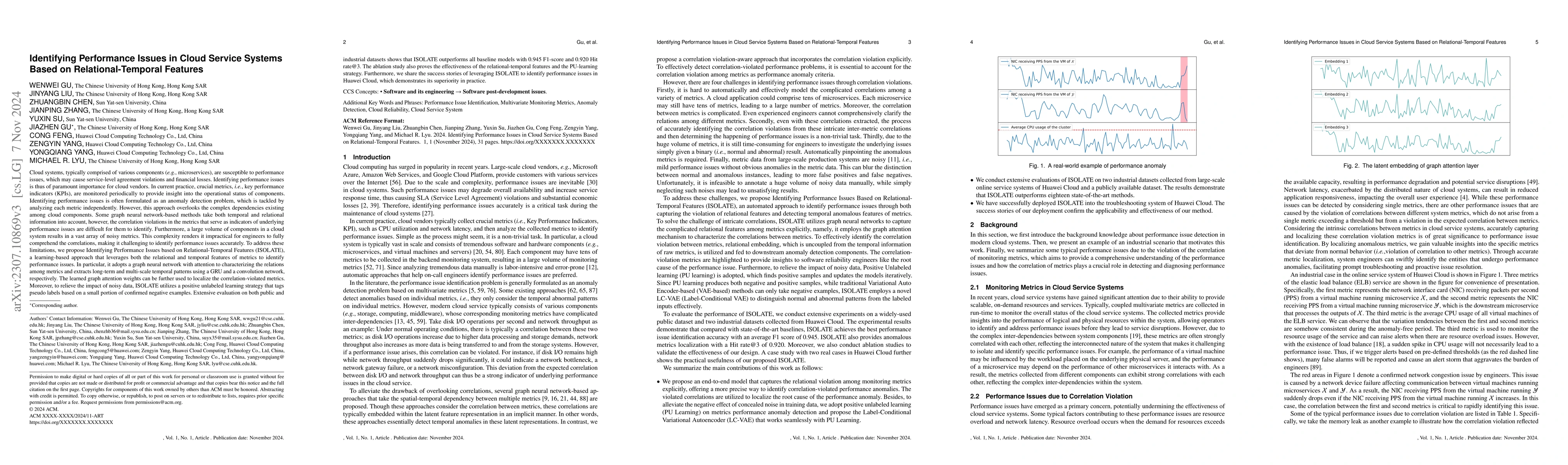 This paper proposes a Relational-Temporal Anomaly Detection Model (RTAnomaly) to identify performance issues in cloud systems by combining temporal and relational patterns of monitoring metrics. It uses a graph attention layer to capture metric dependencies and positive unlabeled learning to handle unlabeled anomalies, achieving superior performance with an average F1 score of 0.929 and Hit@3 of 0.920.