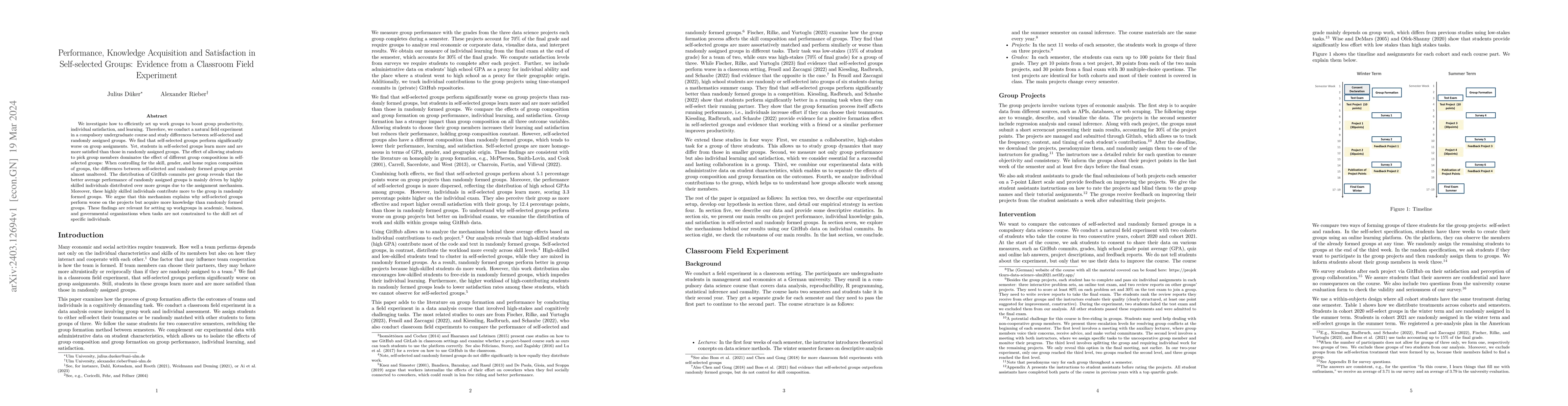 We investigate how to efficiently set up work groups to boost group productivity, individual satisfaction, and learning. Therefore, we conduct a natural field experiment in a compulsory undergraduate course and study differences between self-selected and randomly assigned groups. We find that self-selected groups perform significantly worse on group assignments. Yet, students in self-selected groups learn more and are more satisfied than those in randomly assigned groups. The effect of allowing students to pick group members dominates the effect of different group compositions in self-selected groups: When controlling for the skill, gender, and home region composition of groups, the differences between self-selected and randomly formed groups persist almost unaltered. The distribution of GitHub commits per group reveals that the better average performance of randomly assigned groups is mainly driven by highly skilled individuals distributed over more groups due to the assignment mechanism. Moreover, these highly skilled individuals contribute more to the group in randomly formed groups. We argue that this mechanism explains why self-selected groups perform worse on the projects but acquire more knowledge than randomly formed groups. These findings are relevant for setting up workgroups in academic, business, and governmental organizations when tasks are not constrained to the skill set of specific individuals.