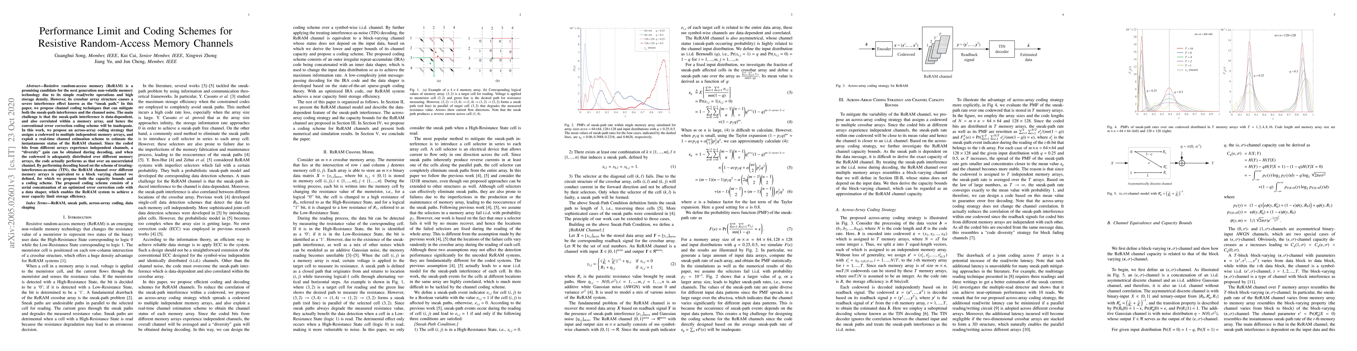 Resistive random-access memory (ReRAM) is a promising candidate for the next generation non-volatile memory technology due to its simple read/write operations and high storage density. However, its crossbar array structure causes a severe interference effect known as the "sneak path." In this paper, we propose channel coding techniques that can mitigate both the sneak-path interference and the channel noise. The main challenge is that the sneak-path interference is data-dependent, and also correlated within a memory array, and hence the conventional error correction coding scheme will be inadequate. In this work, we propose an across-array coding strategy that assigns a codeword to multiple independent memory arrays, and exploit a real-time channel estimation scheme to estimate the instantaneous status of the ReRAM channel. Since the coded bits from different arrays experience independent channels, a "diversity" gain can be obtained during decoding, and when the codeword is adequately distributed over different memory arrays, the code actually performs as that over an uncorrelated channel. By performing decoding based on the scheme of treating-interference-as-noise (TIN), the ReRAM channel over different memory arrays is equivalent to a block varying channel we defined, for which we propose both the capacity bounds and a coding scheme. The proposed coding scheme consists of a serial concatenation of an optimized error correction code with a data shaper, which enables the ReRAM system to achieve a near capacity limit storage efficiency.