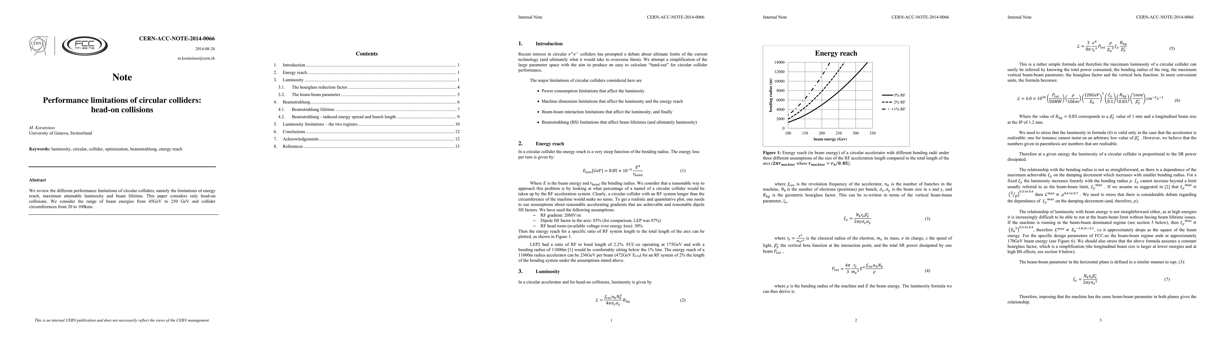 We review the different performance limitations of circular colliders, namely the limitations of energy reach, maximum attainable luminosity and beam lifetime. This paper considers only head-on collisions. We consider the range of beam energies from 45GeV to 250 GeV and collider circumferences from 20 to 100kms.
