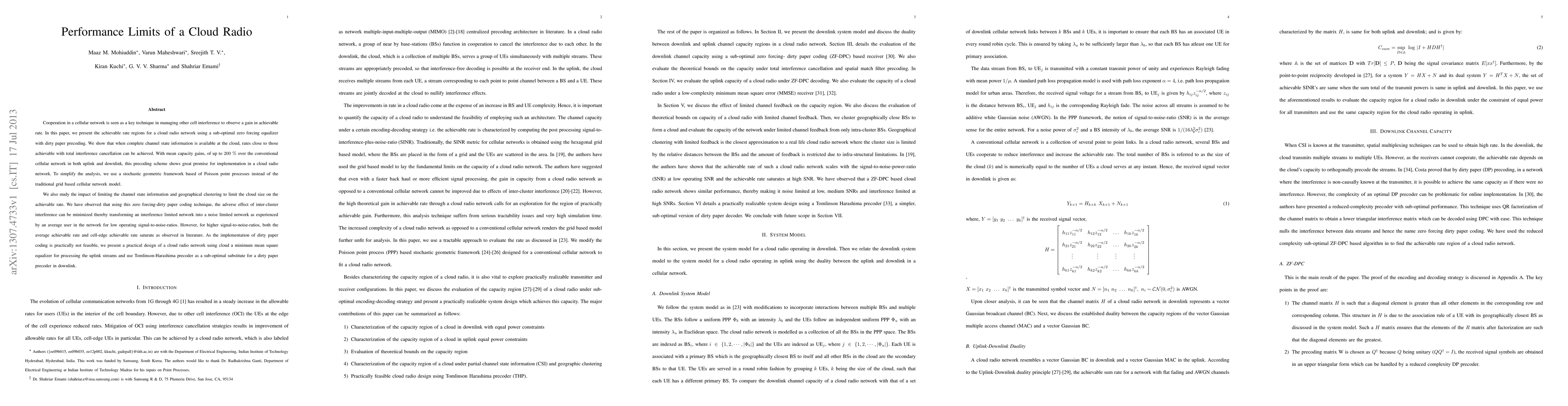 Cooperation in a cellular network is seen as a key technique in managing other cell interference to observe a gain in achievable rate. In this paper, we present the achievable rate regions for a cloud radio network using a sub-optimal zero forcing equalizer with dirty paper precoding. We show that when complete channel state information is available at the cloud, rates close to those achievable with total interference cancellation can be achieved. With mean capacity gains, of up to 2 fold over the conventional cellular network in both uplink and downlink, this precoding scheme shows great promise for implementation in a cloud radio network. To simplify the analysis, we use a stochastic geometric framework based of Poisson point processes instead of the traditional grid based cellular network model. We also study the impact of limiting the channel state information and geographical clustering to limit the cloud size on the achievable rate. We have observed that using this zero forcing-dirty paper coding technique, the adverse effect of inter-cluster interference can be minimized thereby transforming an interference limited network into a noise limited network as experienced by an average user in the network for low operating signal-to-noise-ratios. However, for higher signal-to-noise-ratios, both the average achievable rate and cell-edge achievable rate saturate as observed in literature. As the implementation of dirty paper coding is practically not feasible, we present a practical design of a cloud radio network using cloud a minimum mean square equalizer for processing the uplink streams and use Tomlinson-Harashima precoder as a sub-optimal substitute for a dirty paper precoder in downlink.