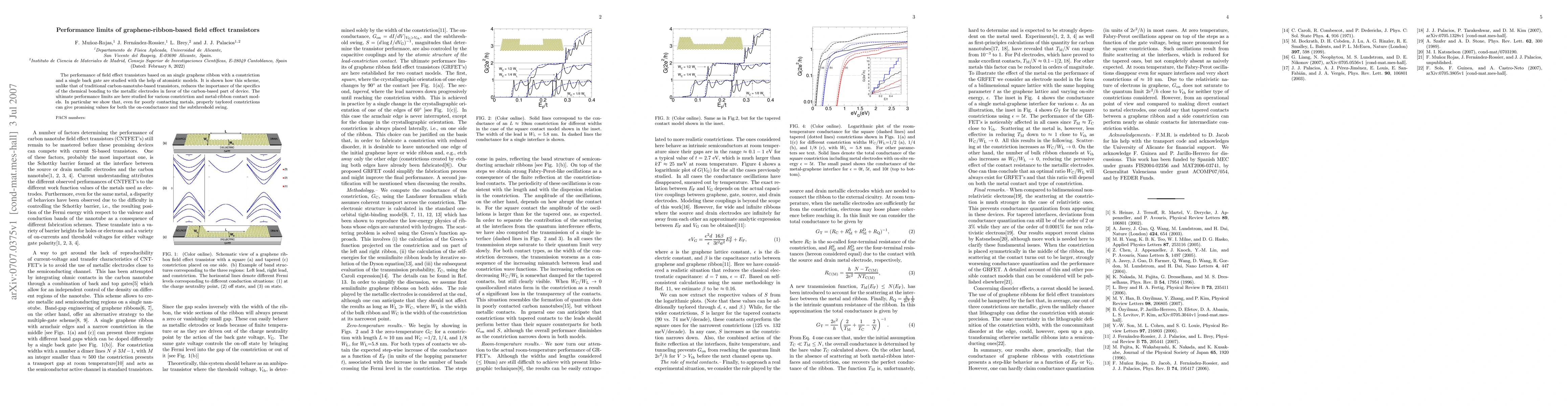 The study investigates the performance of graphene-ribbon-based field effect transistors, demonstrating that their design can minimize the impact of electrode chemical bonding on device performance. The research reveals promising on-conductance and subthreshold swing values even with poor metal-ribbon contacts through optimized constrictions.