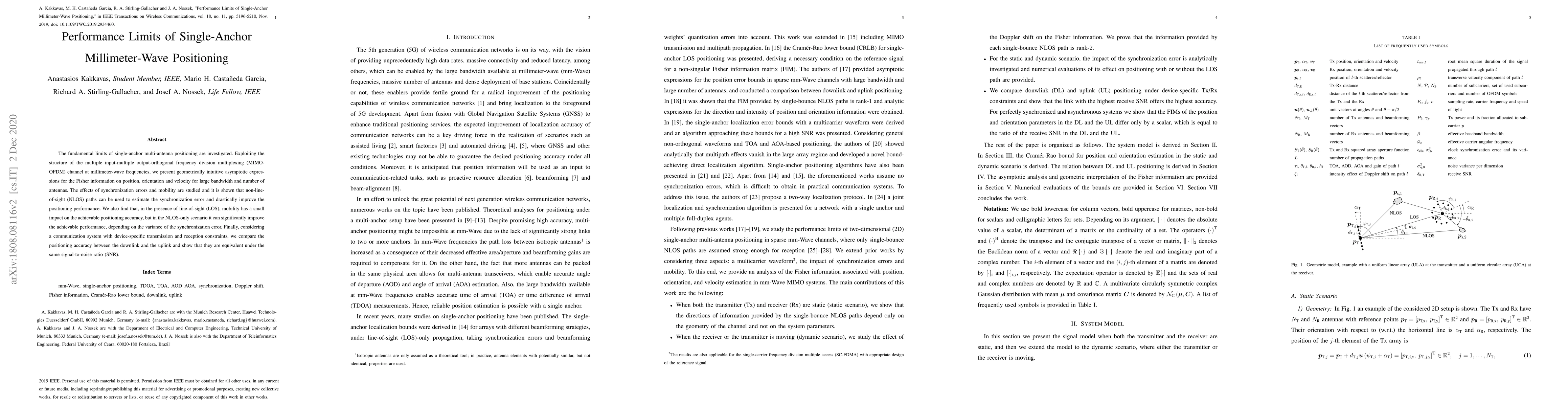 The fundamental limits of single-anchor multi-antenna positioning are investigated. Exploiting the structure of the multiple input-multiple output-orthogonal frequency division multiplexing (MIMO-OFDM) channel at millimeter-wave frequencies, we present geometrically intuitive asymptotic expressions for the Fisher information on position, orientation and velocity for large bandwidth and number of antennas. The effects of synchronization errors and mobility are studied and it is shown that non-line-of-sight (NLOS) paths can be used to estimate the synchronization error and drastically improve the positioning performance. We also find that, in the presence of line-of-sight (LOS), mobility has a small impact on the achievable positioning accuracy, but in the NLOS-only scenario it can significantly improve the achievable performance, depending on the variance of the synchronization error. Finally, considering a communication system with device-specific transmission and reception constraints, we compare the positioning accuracy between the downlink and the uplink and show that they are equivalent under the same signal-to-noise ratio (SNR).