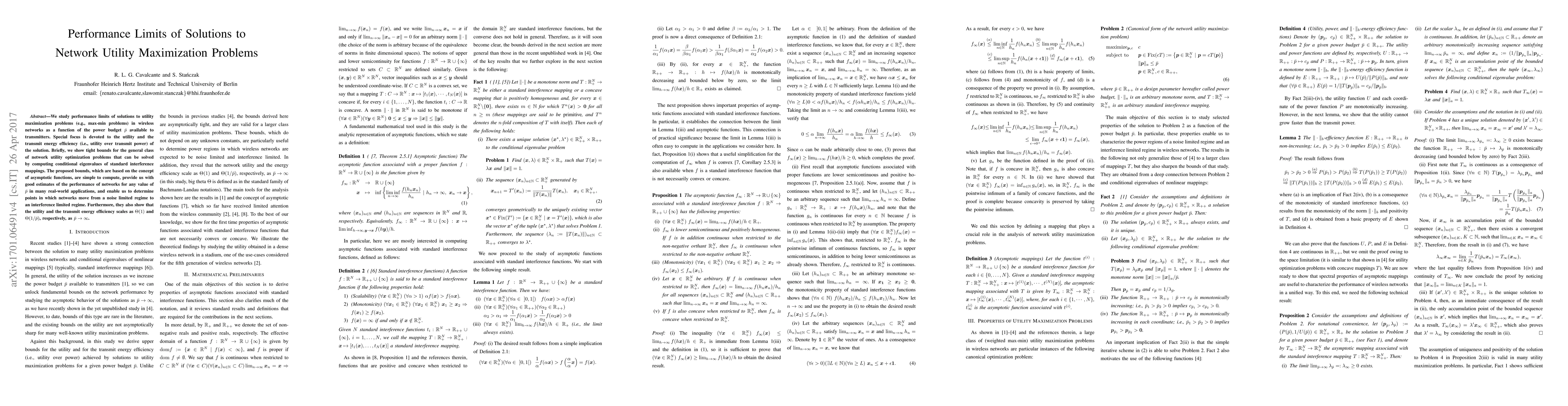 This paper investigates the performance limits of solutions to network utility maximization problems, focusing on utility and transmit energy efficiency. It establishes tight bounds for these problems, revealing that utility scales as $\Theta(1)$ and energy efficiency as $\Theta(1/\bar{p})$ as power budget increases.