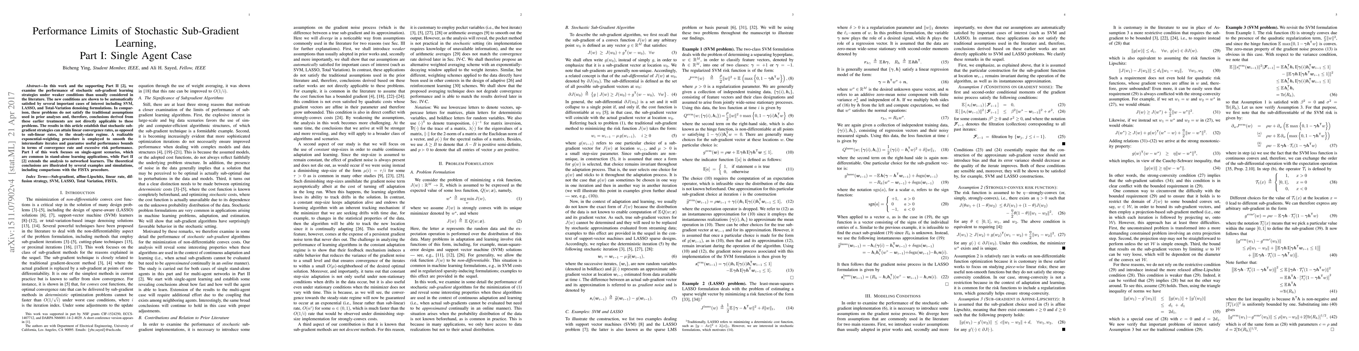 In this work and the supporting Part II, we examine the performance of stochastic sub-gradient learning strategies under weaker conditions than usually considered in the literature. The new conditions are shown to be automatically satisfied by several important cases of interest including SVM, LASSO, and Total-Variation denoising formulations. In comparison, these problems do not satisfy the traditional assumptions used in prior analyses and, therefore, conclusions derived from these earlier treatments are not directly applicable to these problems. The results in this article establish that stochastic sub-gradient strategies can attain linear convergence rates, as opposed to sub-linear rates, to the steady-state regime. A realizable exponential-weighting procedure is employed to smooth the intermediate iterates and guarantee useful performance bounds in terms of convergence rate and excessive risk performance. Part I of this work focuses on single-agent scenarios, which are common in stand-alone learning applications, while Part II extends the analysis to networked learners. The theoretical conclusions are illustrated by several examples and simulations, including comparisons with the FISTA procedure.