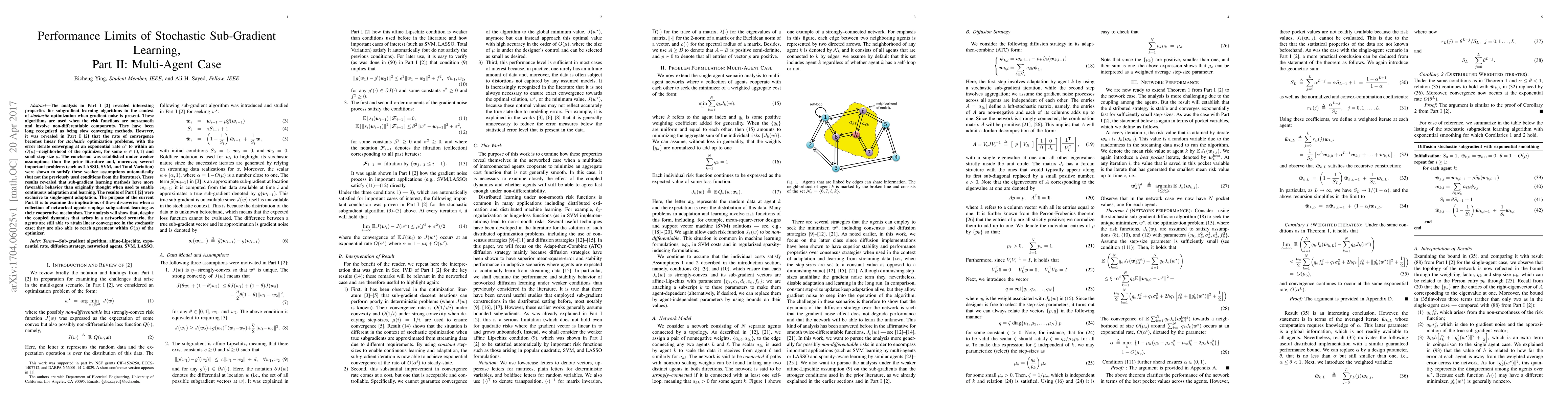 The analysis in Part I revealed interesting properties for subgradient learning algorithms in the context of stochastic optimization when gradient noise is present. These algorithms are used when the risk functions are non-smooth and involve non-differentiable components. They have been long recognized as being slow converging methods. However, it was revealed in Part I that the rate of convergence becomes linear for stochastic optimization problems, with the error iterate converging at an exponential rate $\alpha^i$ to within an $O(\mu)-$neighborhood of the optimizer, for some $\alpha \in (0,1)$ and small step-size $\mu$. The conclusion was established under weaker assumptions than the prior literature and, moreover, several important problems (such as LASSO, SVM, and Total Variation) were shown to satisfy these weaker assumptions automatically (but not the previously used conditions from the literature). These results revealed that sub-gradient learning methods have more favorable behavior than originally thought when used to enable continuous adaptation and learning. The results of Part I were exclusive to single-agent adaptation. The purpose of the current Part II is to examine the implications of these discoveries when a collection of networked agents employs subgradient learning as their cooperative mechanism. The analysis will show that, despite the coupled dynamics that arises in a networked scenario, the agents are still able to attain linear convergence in the stochastic case; they are also able to reach agreement within $O(\mu)$ of the optimizer.