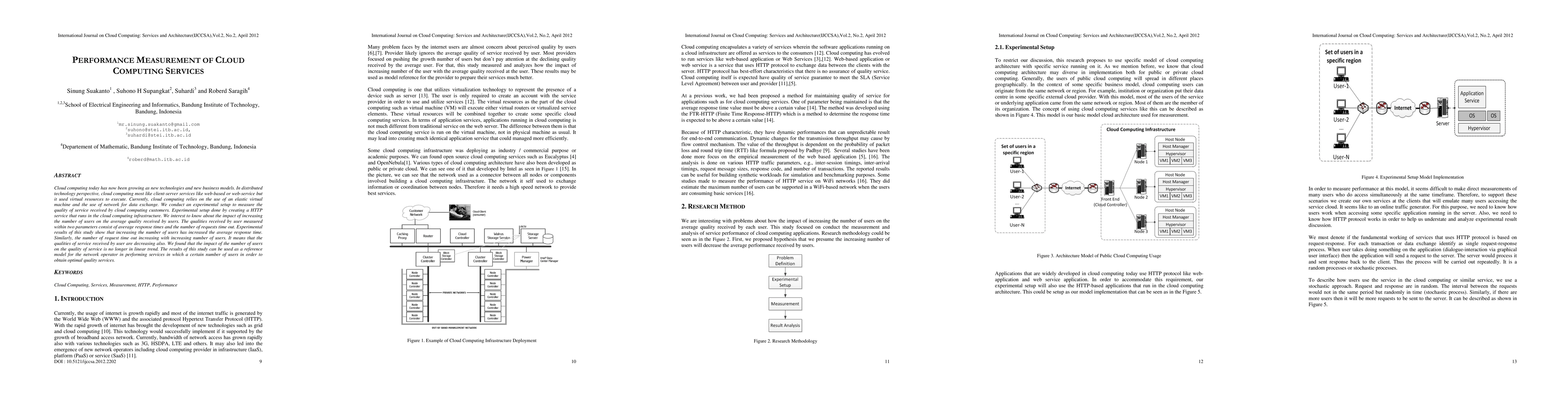 Cloud computing today has now been growing as new technologies and new business models. In distributed technology perspective, cloud computing most like client-server services like web-based or web-service but it used virtual resources to execute. Currently, cloud computing relies on the use of an elastic virtual machine and the use of network for data exchange. We conduct an experimental setup to measure the quality of service received by cloud computing customers. Experimental setup done by creating a HTTP service that runs in the cloud computing infrastructure. We interest to know about the impact of increasing the number of users on the average quality received by users. The qualities received by user measured within two parameters consist of average response times and the number of requests time out. Experimental results of this study show that increasing the number of users has increased the average response time. Similarly, the number of request time out increasing with increasing number of users. It means that the qualities of service received by user are decreasing also. We found that the impact of the number of users on the quality of service is no longer in linear trend. The results of this study can be used as a reference model for the network operator in performing services in which a certain number of users in order to obtain optimal quality services.