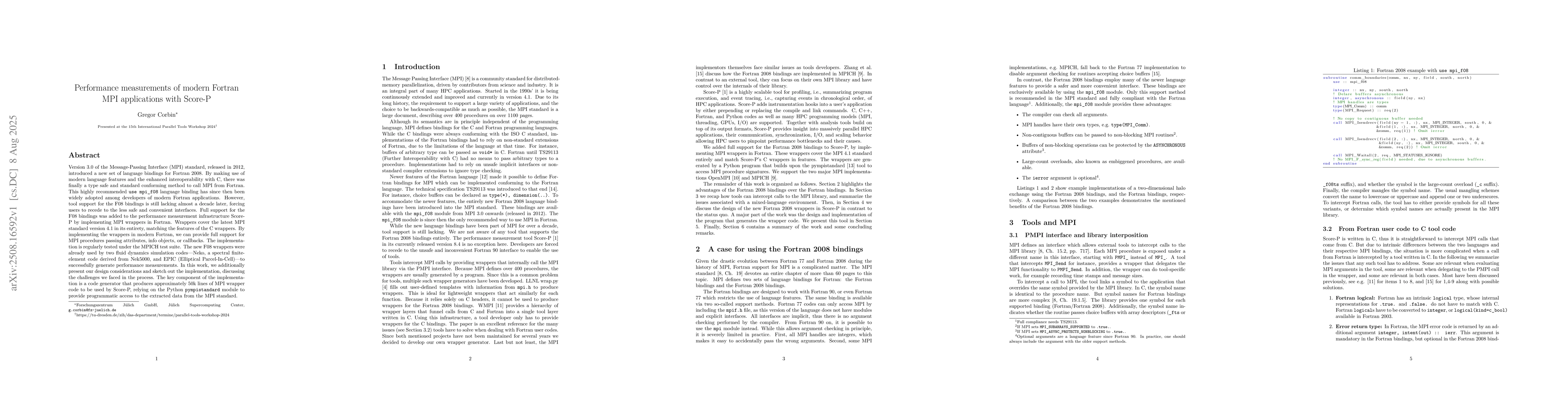 Version 3.0 of the Message-Passing Interface (MPI) standard, released in 2012, introduced a new set of language bindings for Fortran 2008. By making use of modern language features and the enhanced interoperability with C, there was finally a type safe and standard conforming method to call MPI from Fortran. This highly recommended use mpi_f08 language binding has since then been widely adopted among developers of modern Fortran applications. However, tool support for the F08 bindings is still lacking almost a decade later, forcing users to recede to the less safe and convenient interfaces. Full support for the F08 bindings was added to the performance measurement infrastructure Score-P by implementing MPI wrappers in Fortran. Wrappers cover the latest MPI standard version 4.1 in its entirety, matching the features of the C wrappers. By implementing the wrappers in modern Fortran, we can provide full support for MPI procedures passing attributes, info objects, or callbacks. The implementation is regularly tested under the MPICH test suite. The new F08 wrappers were already used by two fluid dynamics simulation codes -- Neko, a spectral finite-element code derived from Nek5000, and EPIC (Elliptical Parcel-In-Cell) -- to successfully generate performance measurements. In this work, we additionally present our design considerations and sketch out the implementation, discussing the challenges we faced in the process. The key component of the implementation is a code generator that produces approximately 50k lines of MPI wrapper code to be used by Score-P, relying on the Python pympistandard module to provide programmatic access to the extracted data from the MPI standard.