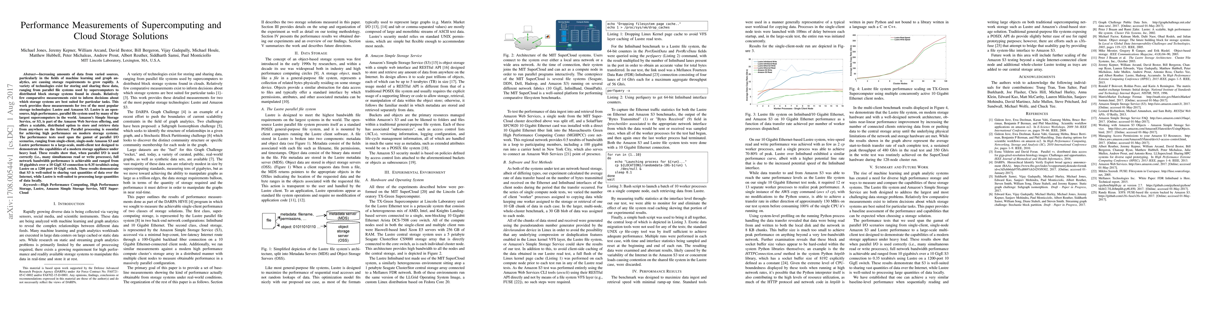 Increasing amounts of data from varied sources, particularly in the fields of machine learning and graph analytics, are causing storage requirements to grow rapidly. A variety of technologies exist for storing and sharing these data, ranging from parallel file systems used by supercomputers to distributed block storage systems found in clouds. Relatively few comparative measurements exist to inform decisions about which storage systems are best suited for particular tasks. This work provides these measurements for two of the most popular storage technologies: Lustre and Amazon S3. Lustre is an open-source, high performance, parallel file system used by many of the largest supercomputers in the world. Amazon's Simple Storage Service, or S3, is part of the Amazon Web Services offering, and offers a scalable, distributed option to store and retrieve data from anywhere on the Internet. Parallel processing is essential for achieving high performance on modern storage systems. The performance tests used span the gamut of parallel I/O scenarios, ranging from single-client, single-node Amazon S3 and Lustre performance to a large-scale, multi-client test designed to demonstrate the capabilities of a modern storage appliance under heavy load. These results show that, when parallel I/O is used correctly (i.e., many simultaneous read or write processes), full network bandwidth performance is achievable and ranged from 10 gigabits/s over a 10 GigE S3 connection to 0.35 terabits/s using Lustre on a 1200 port 10 GigE switch. These results demonstrate that S3 is well-suited to sharing vast quantities of data over the Internet, while Lustre is well-suited to processing large quantities of data locally.