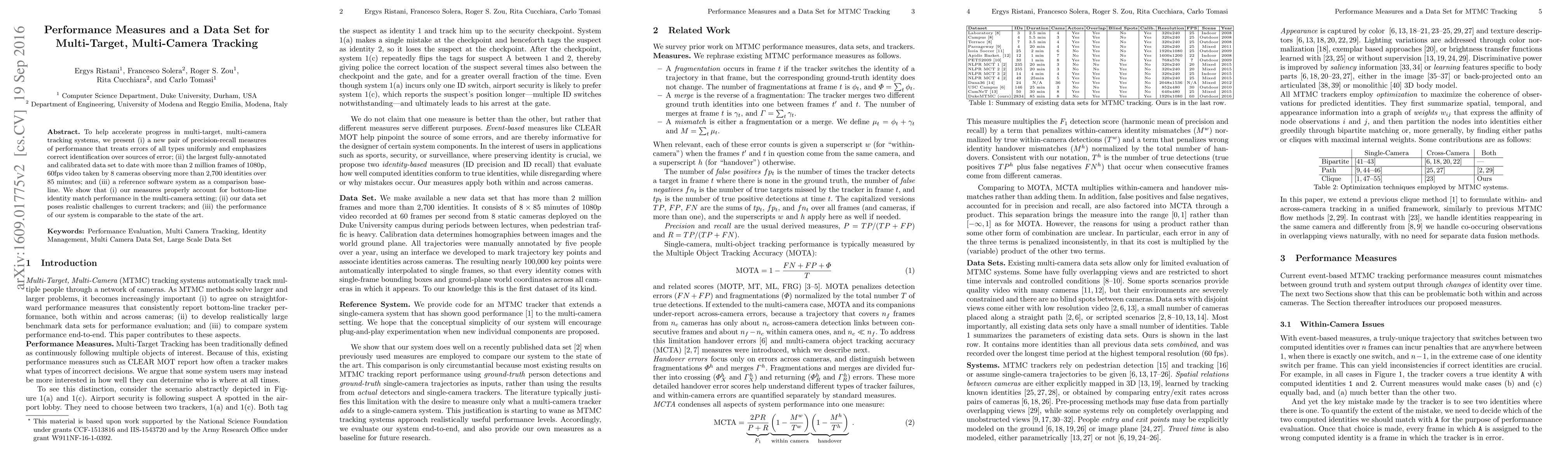 This paper introduces new precision-recall measures for multi-target, multi-camera tracking, along with a large, fully-annotated data set and a reference software system. The measures emphasize correct identification and the data set presents realistic challenges for current tracking systems.