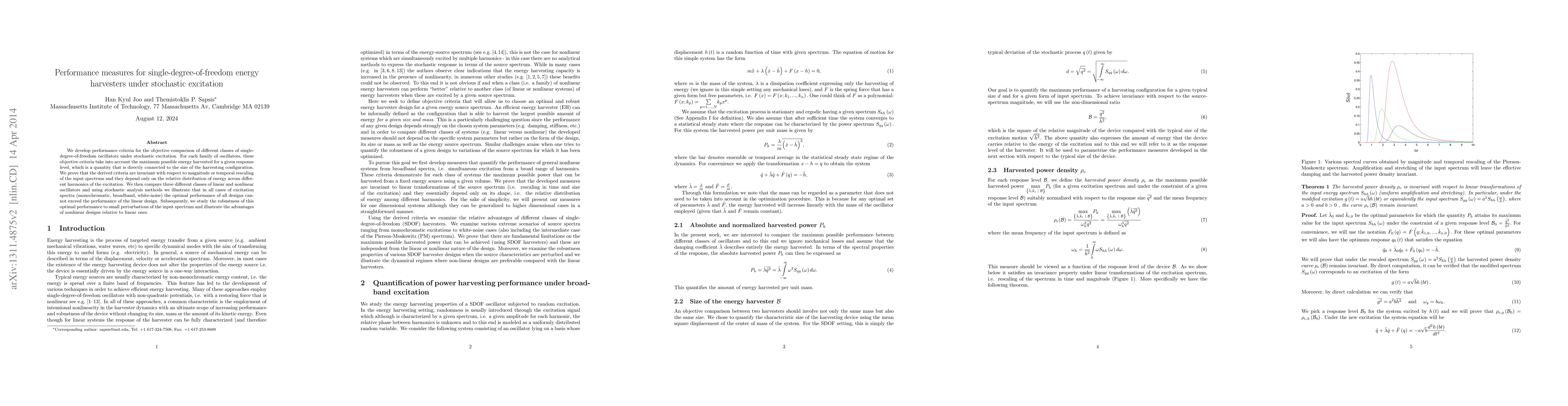 This paper develops performance criteria for comparing single-degree-of-freedom energy harvesters under stochastic excitation, proving that linear designs are optimal for maximum energy harvest regardless of excitation type. It also examines the robustness of nonlinear designs against small input spectrum variations.