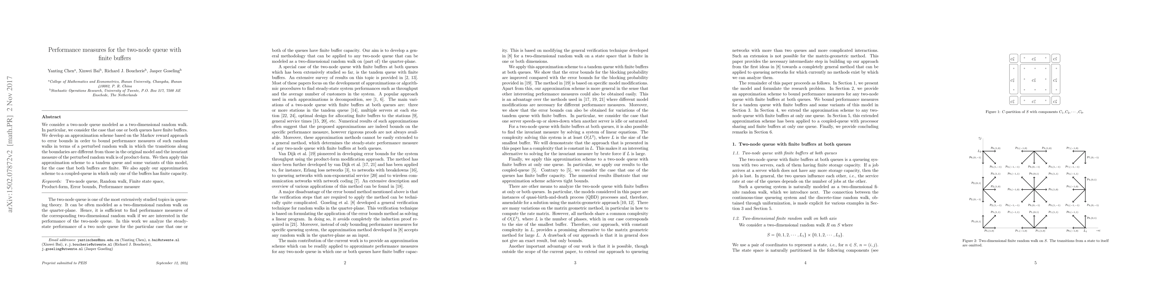 This paper develops an approximation scheme based on Markov rewards to analyze performance measures for a two-node queue modeled as a two-dimensional random walk with finite buffers. The scheme uses a perturbed random walk to derive bounds, which is then applied to tandem and coupled-queue models with finite capacities.