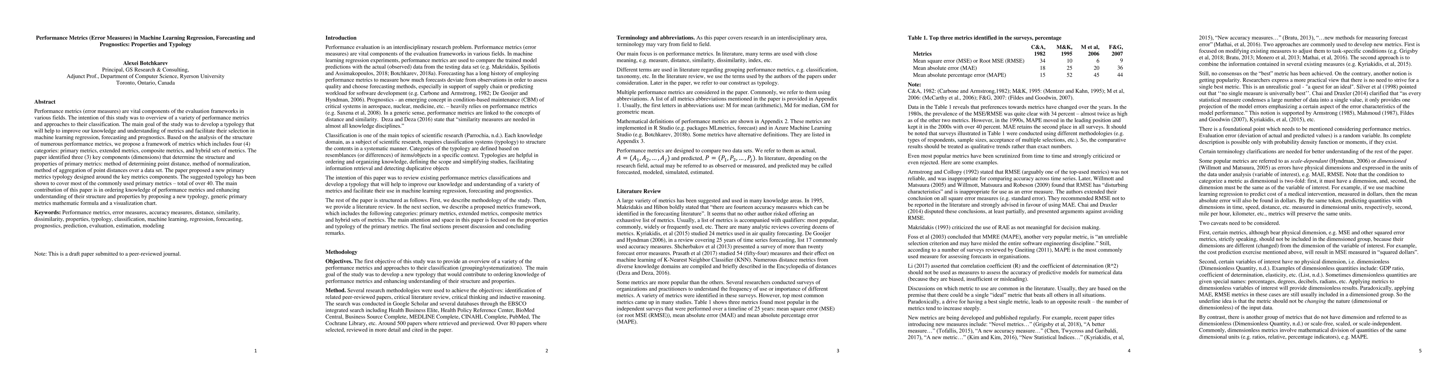 Performance metrics (error measures) are vital components of the evaluation frameworks in various fields. The intention of this study was to overview of a variety of performance metrics and approaches to their classification. The main goal of the study was to develop a typology that will help to improve our knowledge and understanding of metrics and facilitate their selection in machine learning regression, forecasting and prognostics. Based on the analysis of the structure of numerous performance metrics, we propose a framework of metrics which includes four (4) categories: primary metrics, extended metrics, composite metrics, and hybrid sets of metrics. The paper identified three (3) key components (dimensions) that determine the structure and properties of primary metrics: method of determining point distance, method of normalization, method of aggregation of point distances over a data set.