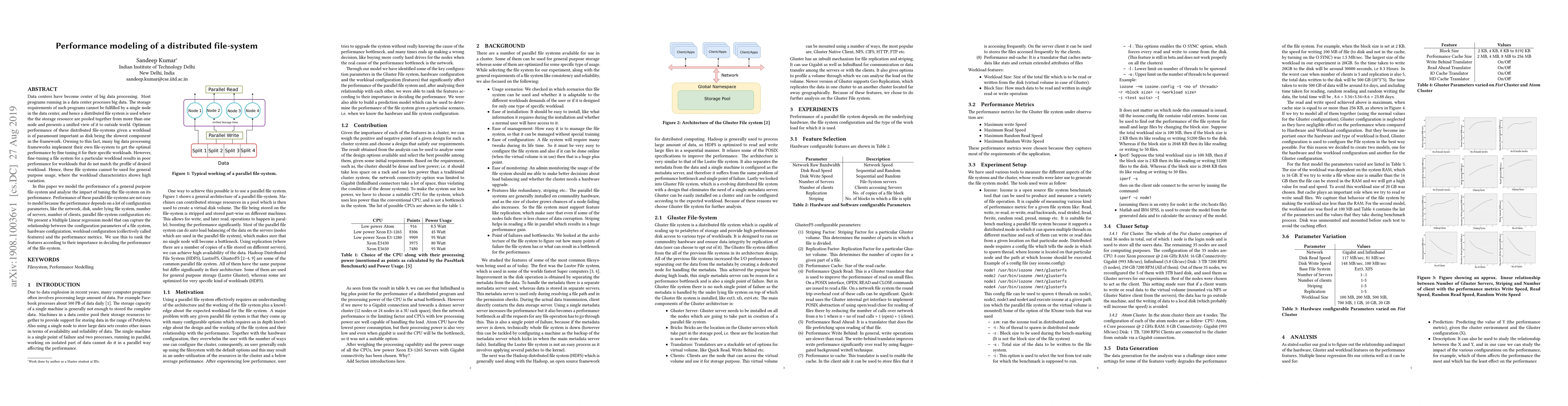 Data centers have become center of big data processing. Most programs running in a data center processes big data. The storage requirements of such programs cannot be fulfilled by a single node in the data center, and hence a distributed file system is used where the the storage resource are pooled together from more than one node and presents a unified view of it to outside world. Optimum performance of these distributed file-systems given a workload is of paramount important as disk being the slowest component in the framework. Owning to this fact, many big data processing frameworks implement their own file-system to get the optimal performance by fine tuning it for their specific workloads. However, fine-tuning a file system for a particular workload results in poor performance for workloads that do not match the profile of desired workload. Hence, these file systems cannot be used for general purpose usage, where the workload characteristics shows high variation. In this paper we model the performance of a general purpose file-system and analyse the impact of tuning the file-system on its performance. Performance of these parallel file-systems are not easy to model because the performance depends on a lot of configuration parameters, like the network, disk, under lying file system, number of servers, number of clients, parallel file-system configuration etc. We present a Multiple Linear regression model that can capture the relationship between the configuration parameters of a file system, hardware configuration, workload configuration (collectively called features) and the performance metrics. We use this to rank the features according to their importance in deciding the performance of the file-system.
