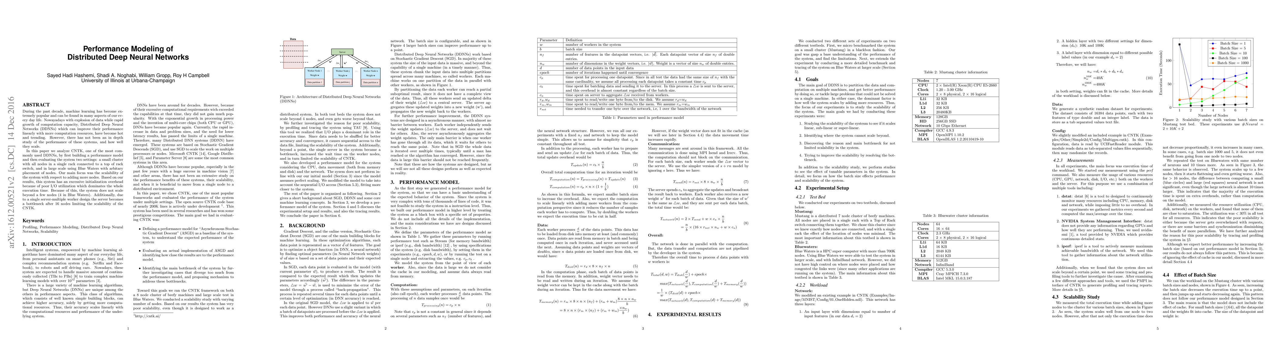 During the past decade, machine learning has become extremely popular and can be found in many aspects of our every day life. Nowayadays with explosion of data while rapid growth of computation capacity, Distributed Deep Neural Networks (DDNNs) which can improve their performance linearly with more computation resources, have become hot and trending. However, there has not been an in depth study of the performance of these systems, and how well they scale. In this paper we analyze CNTK, one of the most commonly used DDNNs, by first building a performance model and then evaluating the system two settings: a small cluster with all nodes in a single rack connected to a top of rack switch, and in large scale using Blue Waters with arbitary placement of nodes. Our main focus was the scalability of the system with respect to adding more nodes. Based on our results, this system has an excessive initialization overhead because of poor I/O utilization which dominates the whole execution time. Because of this, the system does not scale beyond a few nodes (4 in Blue Waters). Additionally, due to a single server-multiple worker design the server becomes a bottleneck after 16 nodes limiting the scalability of the CNTK.
