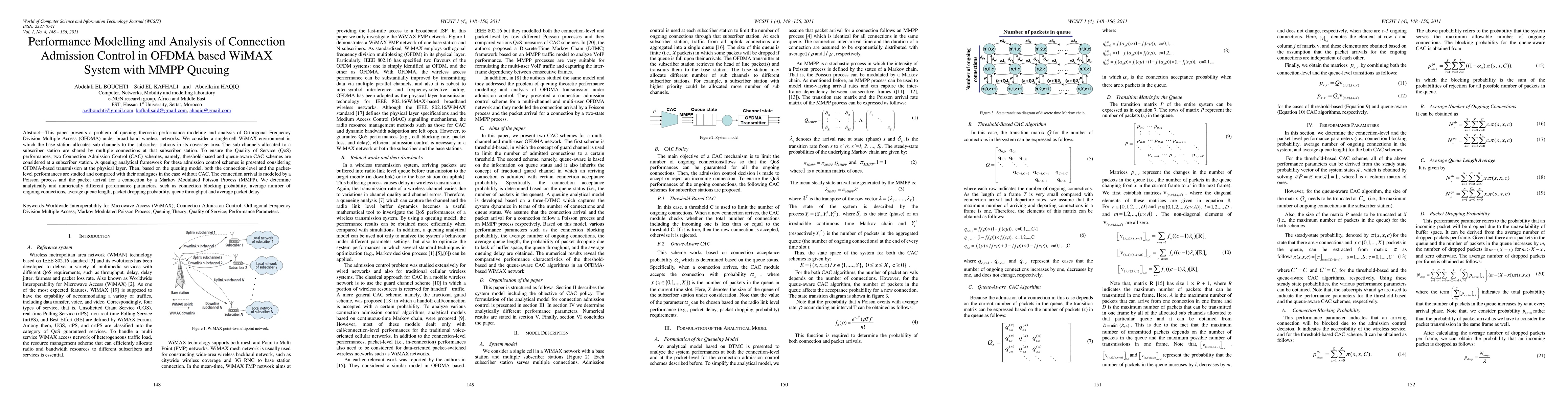 This paper models and analyzes the performance of Connection Admission Control (CAC) in OFDMA-based WiMAX systems using queuing theory. It compares threshold-based and queue-aware CAC schemes, determining key performance metrics like connection blocking probability and average queue length analytically.