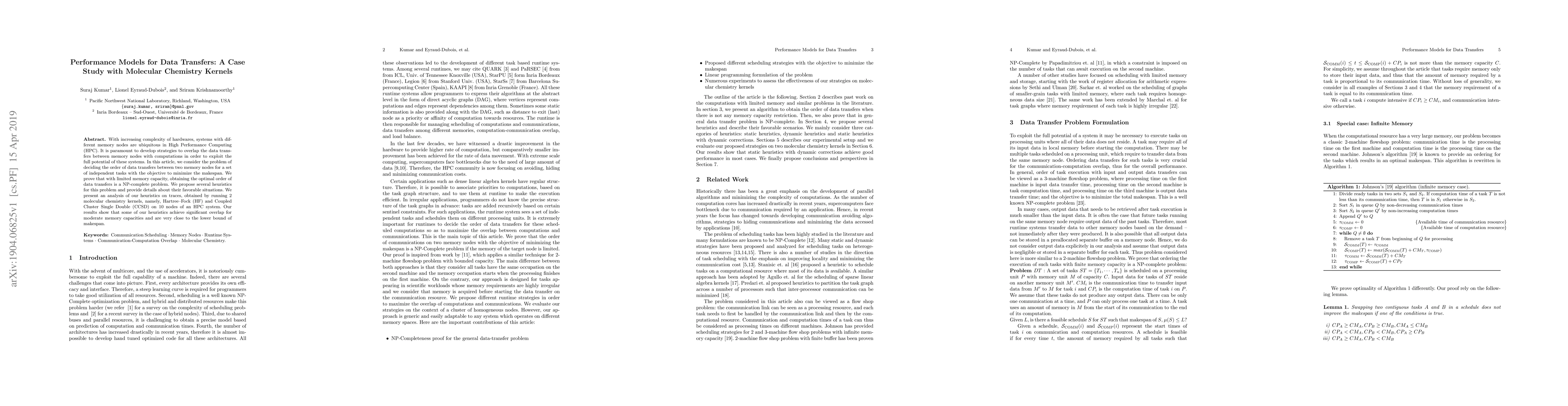 This paper investigates strategies to minimize makespan by overlapping data transfers with computations in High Performance Computing systems, proving the problem of optimal data transfer order is NP-complete. It proposes heuristics and demonstrates their effectiveness through analysis on molecular chemistry kernels, showing significant performance gains under moderate memory constraints.
