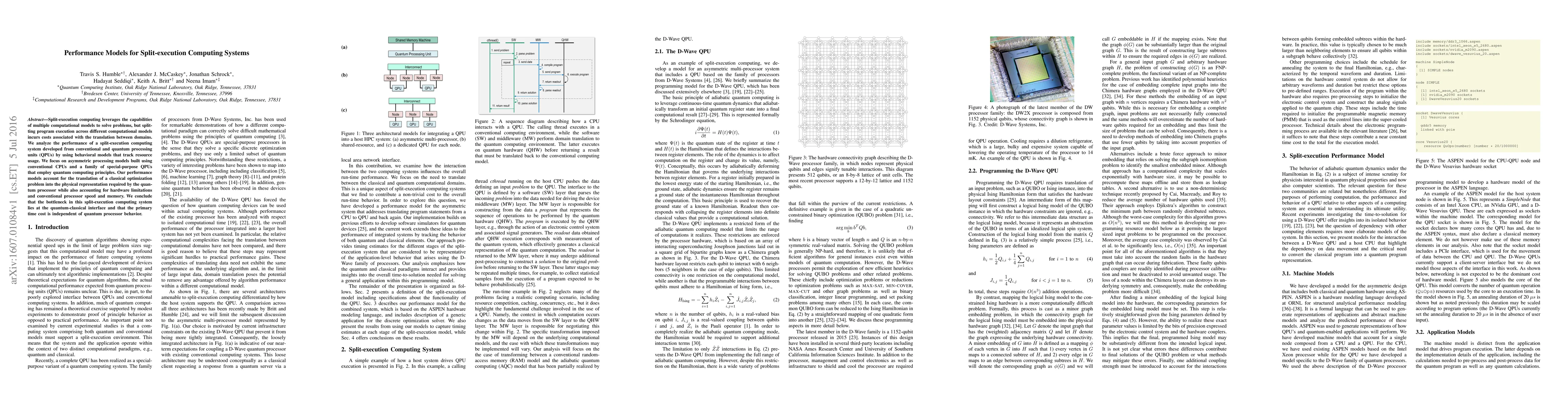 This paper develops performance models for split-execution computing systems combining conventional and quantum processors, identifying the quantum-classical interface as the main bottleneck. The models account for translation costs and hardware limitations, revealing that the primary time cost is independent of quantum processor behavior.